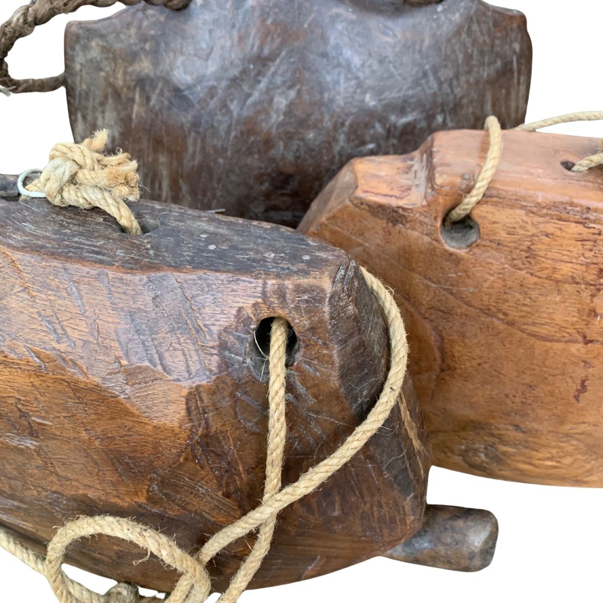 Diese alten indischen Kuhglocken aus Holz sind handgefertigte Unikate mit sichtbaren Spuren der Zeit.