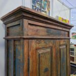 Dieser Holzschrank beeindruckt durch seine ausdrucksstarke, mehrfarbig gealterte Oberfläche, bei der sich warme Braun-, Blau- und Grüntöne miteinander verbinden. Die klare, klassische Form mit zwei Türen und einer unteren Schublade bietet praktischen Stauraum für verschiedenste Gegenstände. Im Inneren sorgen mehrere Einlegeböden für eine übersichtliche Aufteilung. Ein charaktervolles Einzelstück mit authentischem, handwerklichem Charme und lebendiger Patina.