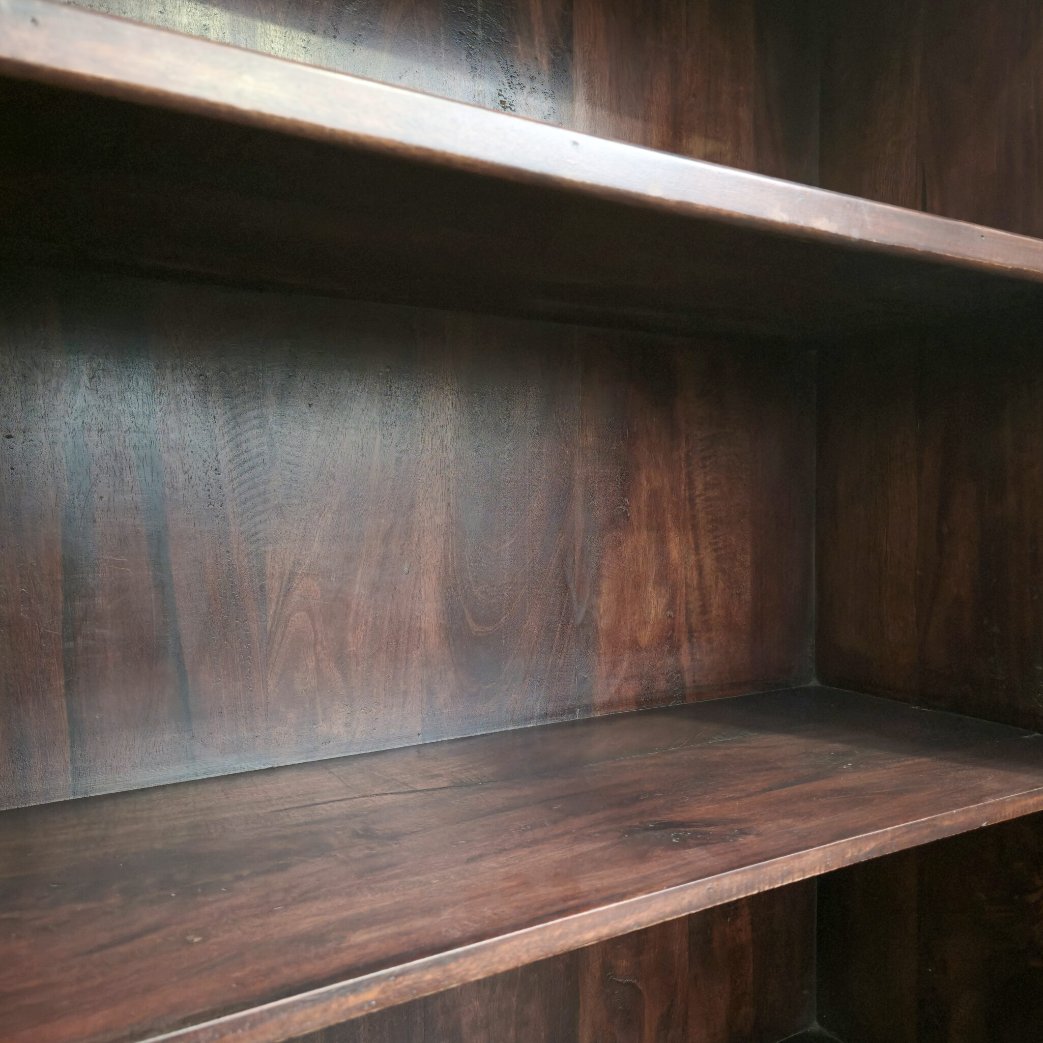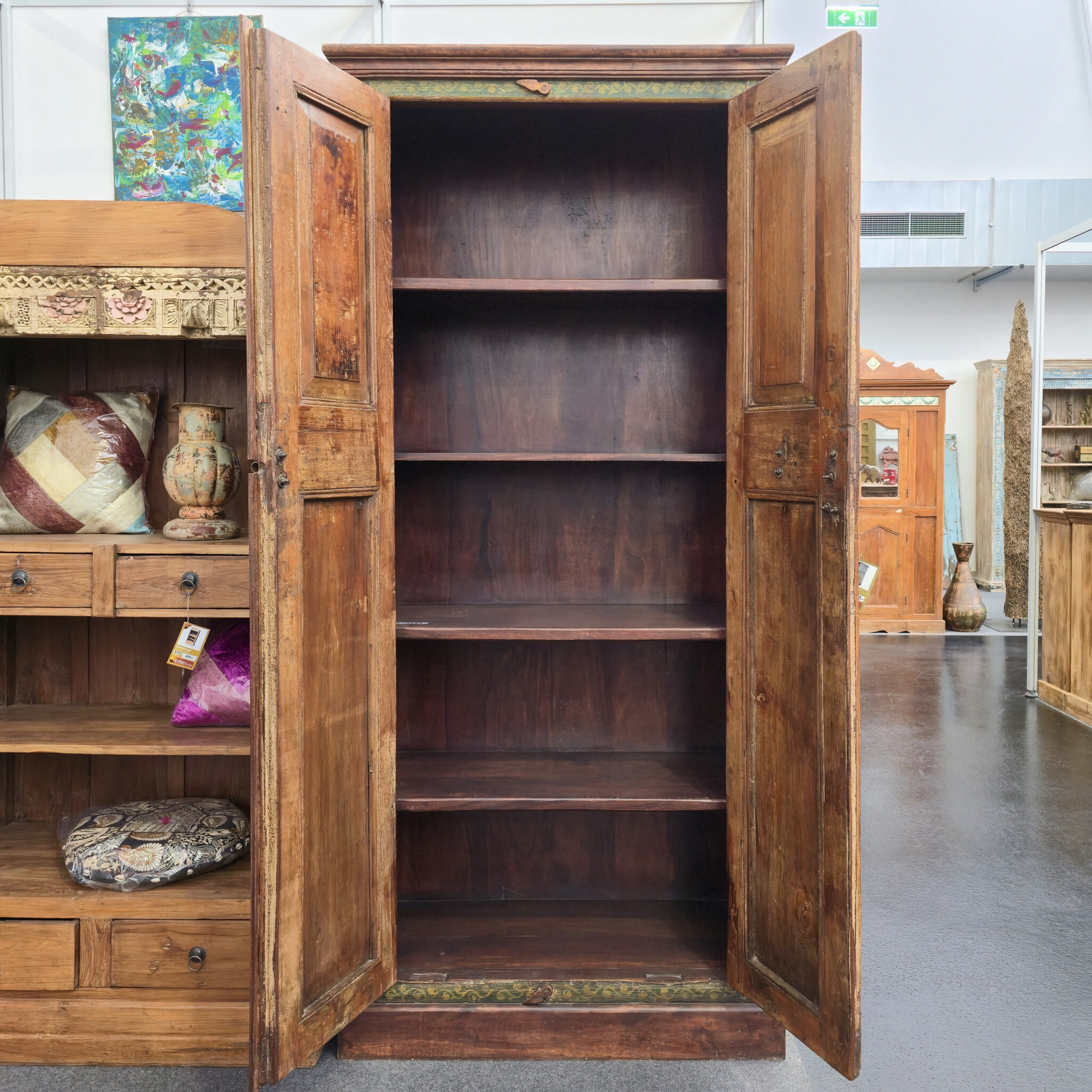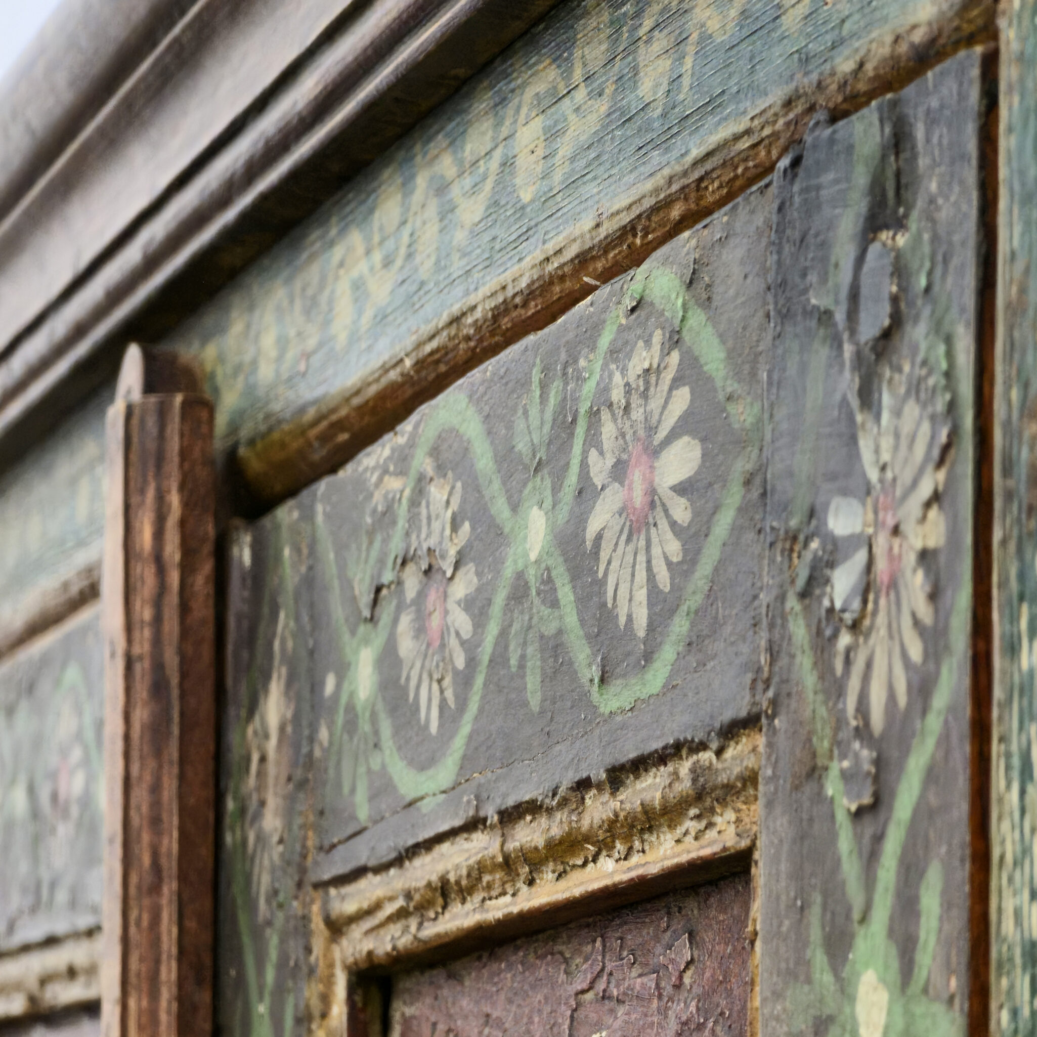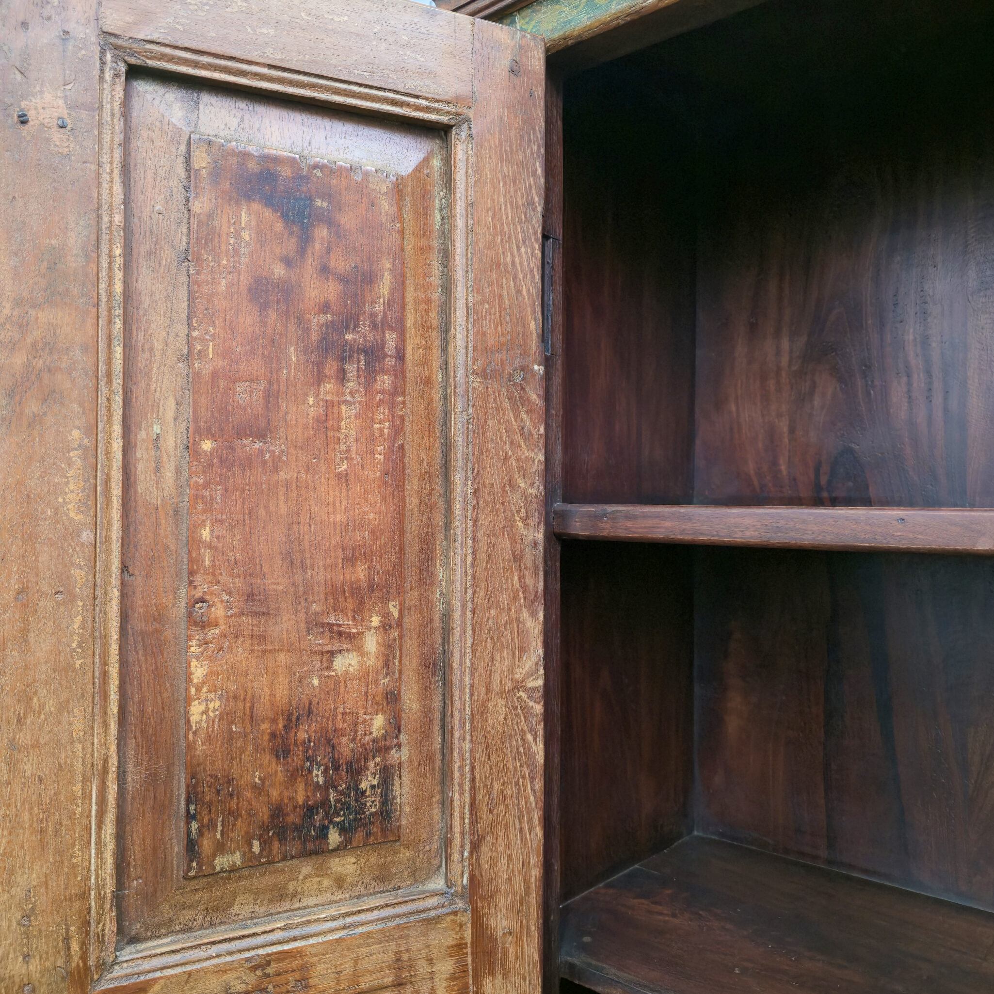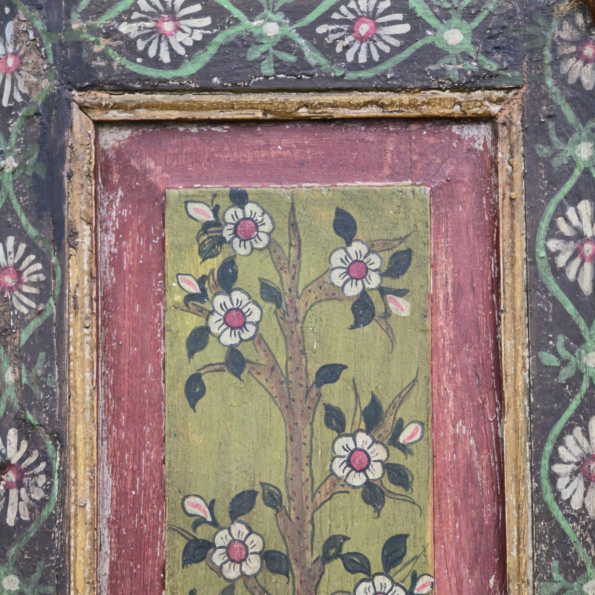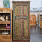 Produktbeschreibung Dieser handbemalte Schrank aus echtem Holz ist ein wahres Meisterstück traditioneller Handwerkskunst. Die Fronten bestechen durch kunstvolle florale Ornamente in harmonischen Grün- und Rottönen, die jedem Raum eine exklusive, antike Note verleihen. Dank der soliden Bauweise und der vier fixen Fachböden bietet dieser Schrank im Innenraum reichlich Platz für Ihre Habseligkeiten. Ein rustikaler Eisenriegel unterstreicht den authentischen Vintage-Look und sorgt für einen sicheren Verschluss der beiden Flügeltüren. Die natürliche Maserungdes Holzes bleibt im dunkler lasierten Innenbereich sichtbar und zeugt von der hohen Qualität des verwendeten Materials.