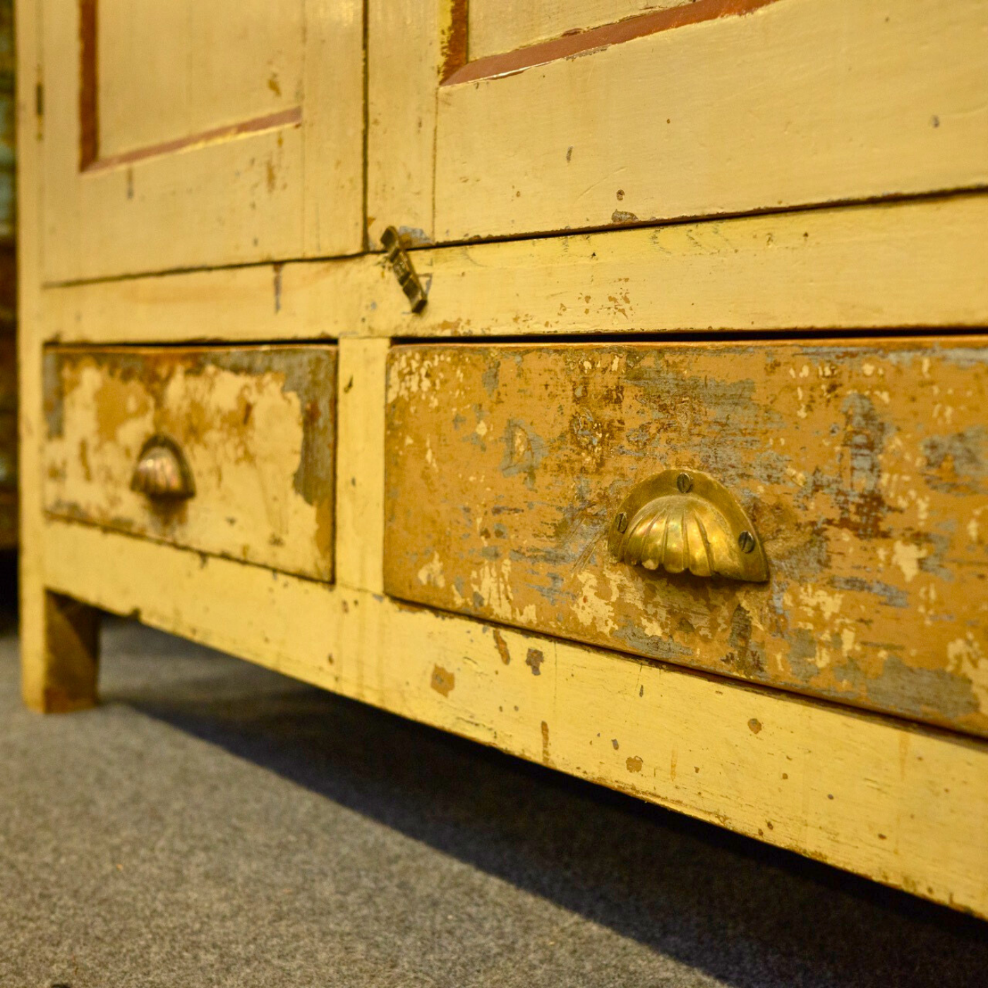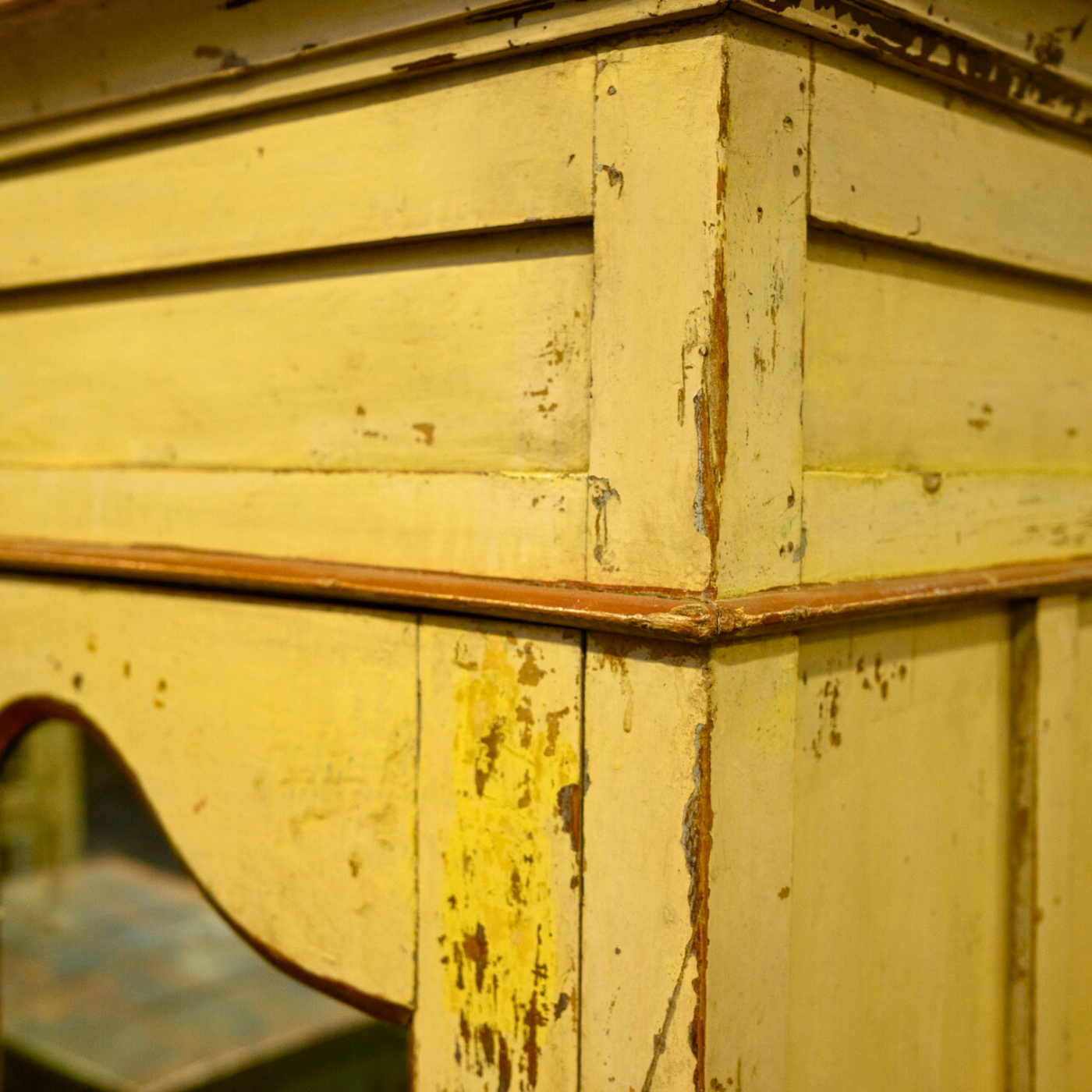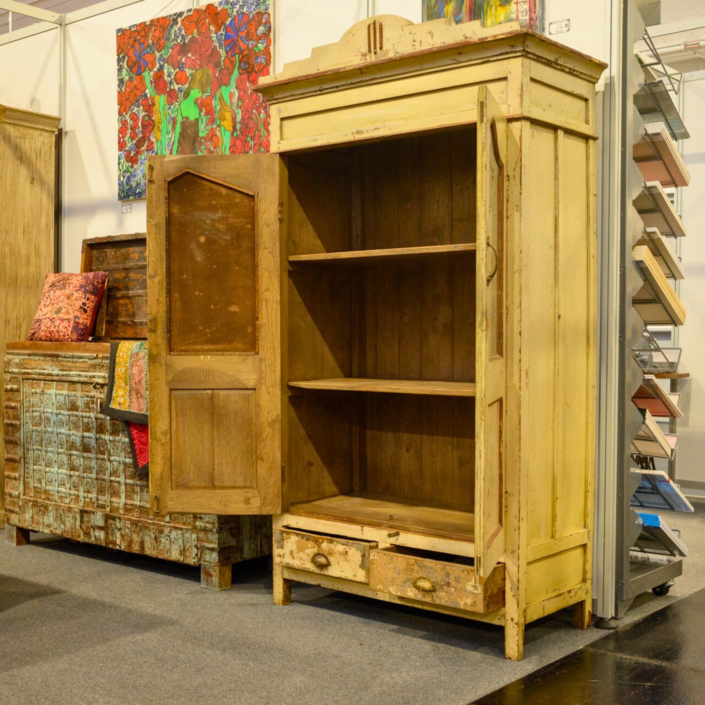 Heller indischer Holzschrank mit Spiegeltüren und unterer Schublade. Gefertigt aus massivem Holz mit charaktervoller, gealterter Oberfläche. Hinter den Türen bietet der Schrank Stauraum für Geschirr, Textilien oder Dekorationsobjekte. Ein ausdrucksstarkes Einzelstück für Wohn- oder Essbereiche.