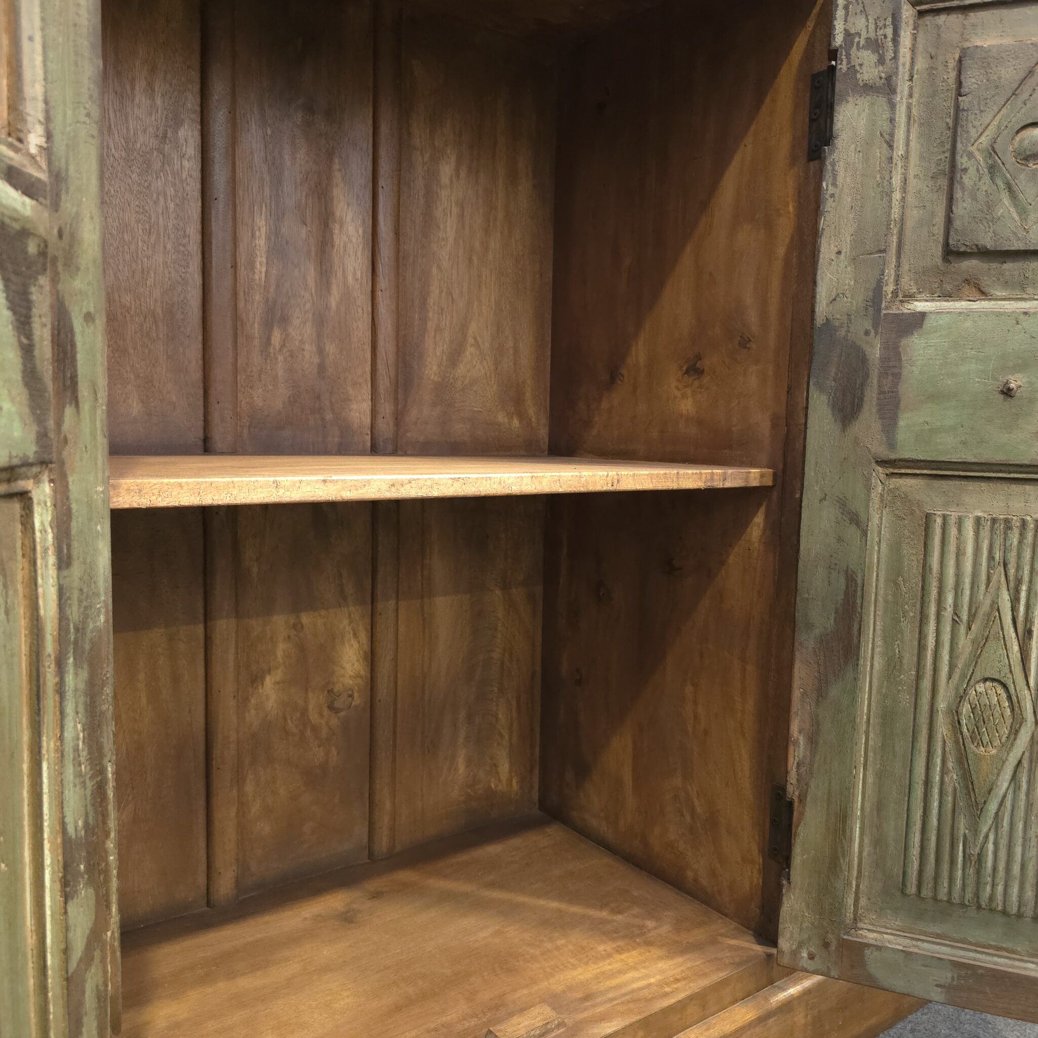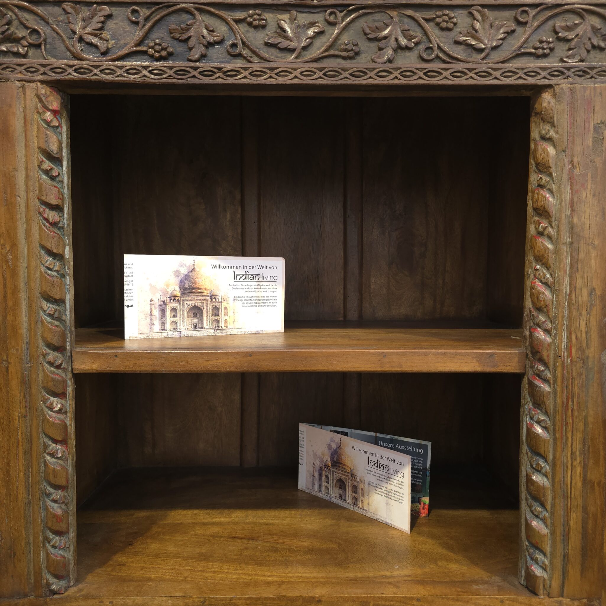 Der exklusive Schrank aus echtem Holz ist ein Paradebeispiel für die meisterhafte indische Schnitzkunst. Jedes Element der Front wurde mit großer Sorgfalt von Hand ausgearbeitet. Somit stellt dieses Möbelstück ein wertvolles Unikat für Ihr Zuhause dar. Die natürliche Maserung des Holzes verleiht dem Objekt eine lebendige Ausstrahlung. Zudem sorgt die massive Bauweise für eine ausgezeichnete Standfestigkeit. Der Schrank ist deshalb weit mehr als eine praktische Stauraumlösung. Er fungiert als künstlerisches Zentrum in jedem Raum. Darüber hinaus zeugt die detaillierte Oberfläche von einer tiefen Liebe zum traditionellen Handwerk.
