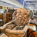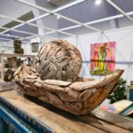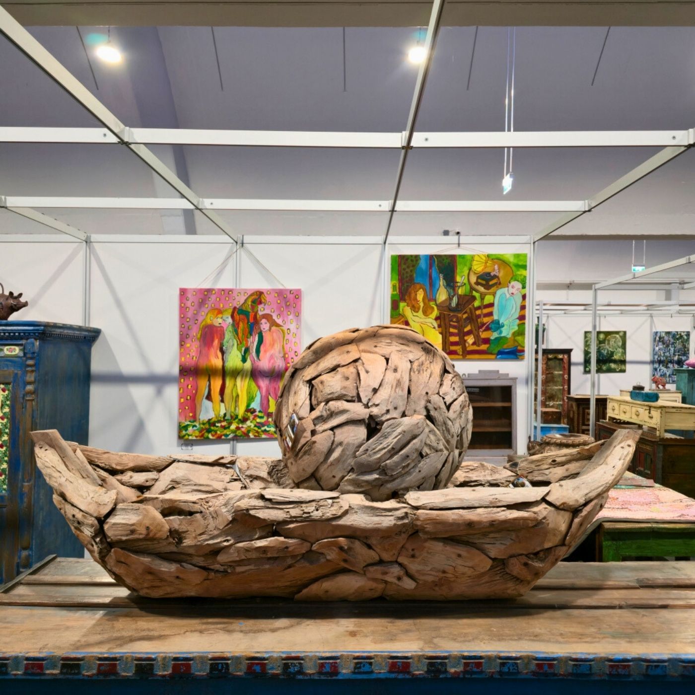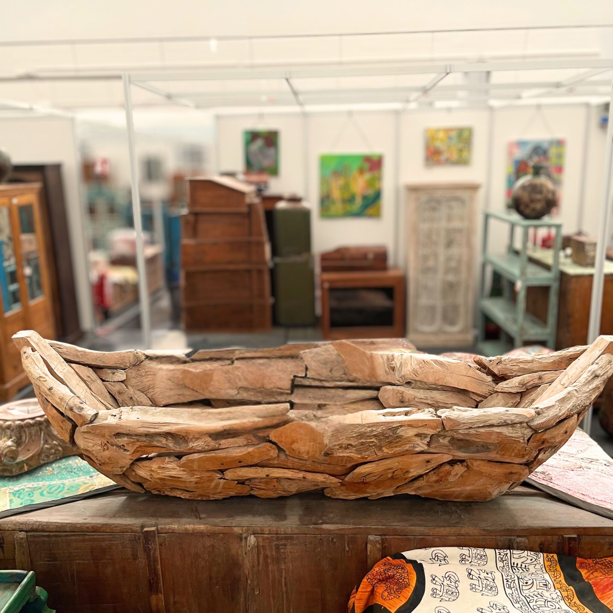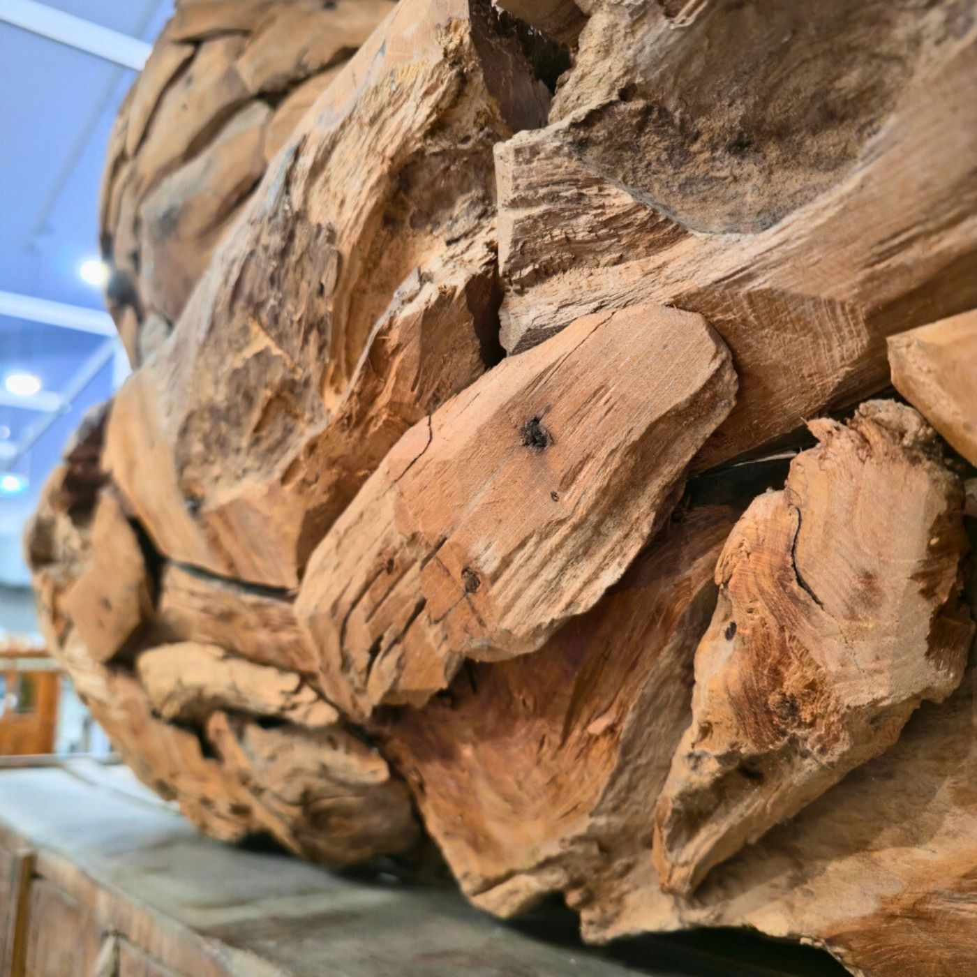 Die markante Struktur des Holzes und die individuell zusammengesetzten Elemente unterstreichen den natürlichen Charakter – jedes Exemplar ist ein Unikat mit eigener Geschichte. Ideal als stilvolles Highlight für Wohnräume oder Ausstellungen.