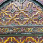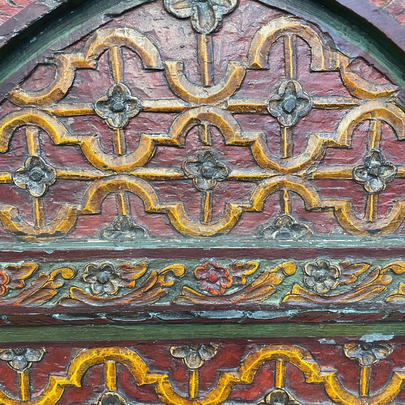 Die aufwendig geschnitzten und von Hand bemalten Ornamente erzählen von der reichen Handwerkskunst Rajasthans. Das Motiv des geschwungenen Torbogens (Arch-Design) erinnert an die Pracht alter Paläste und Tempelportale.