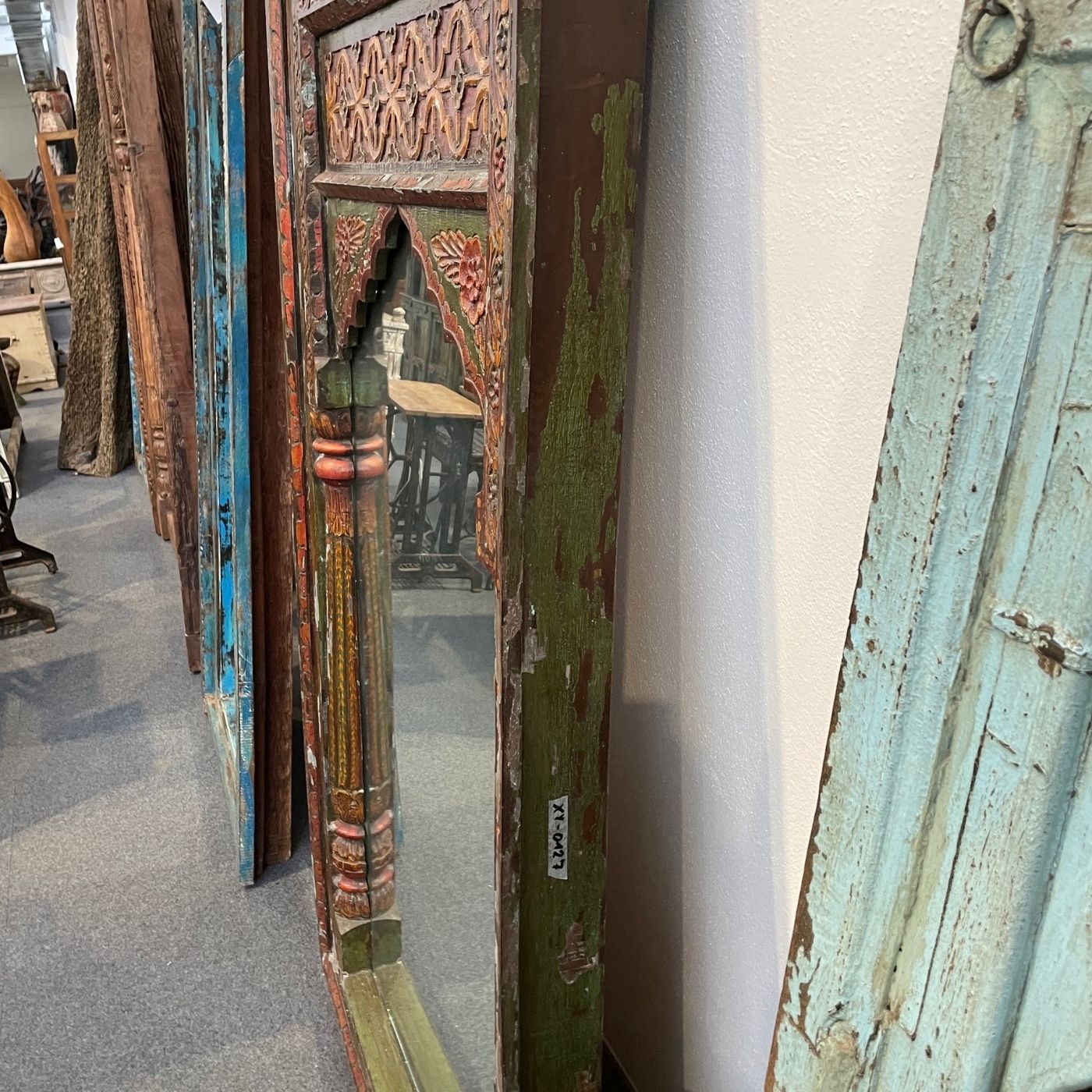 Ein Spiegel, der nicht nur den Raum, sondern auch die Seele erhellt – dieser imposante Ganzkörperspiegel stammt aus Indien und besticht durch seinen detailreich verzierten Holzrahmen.