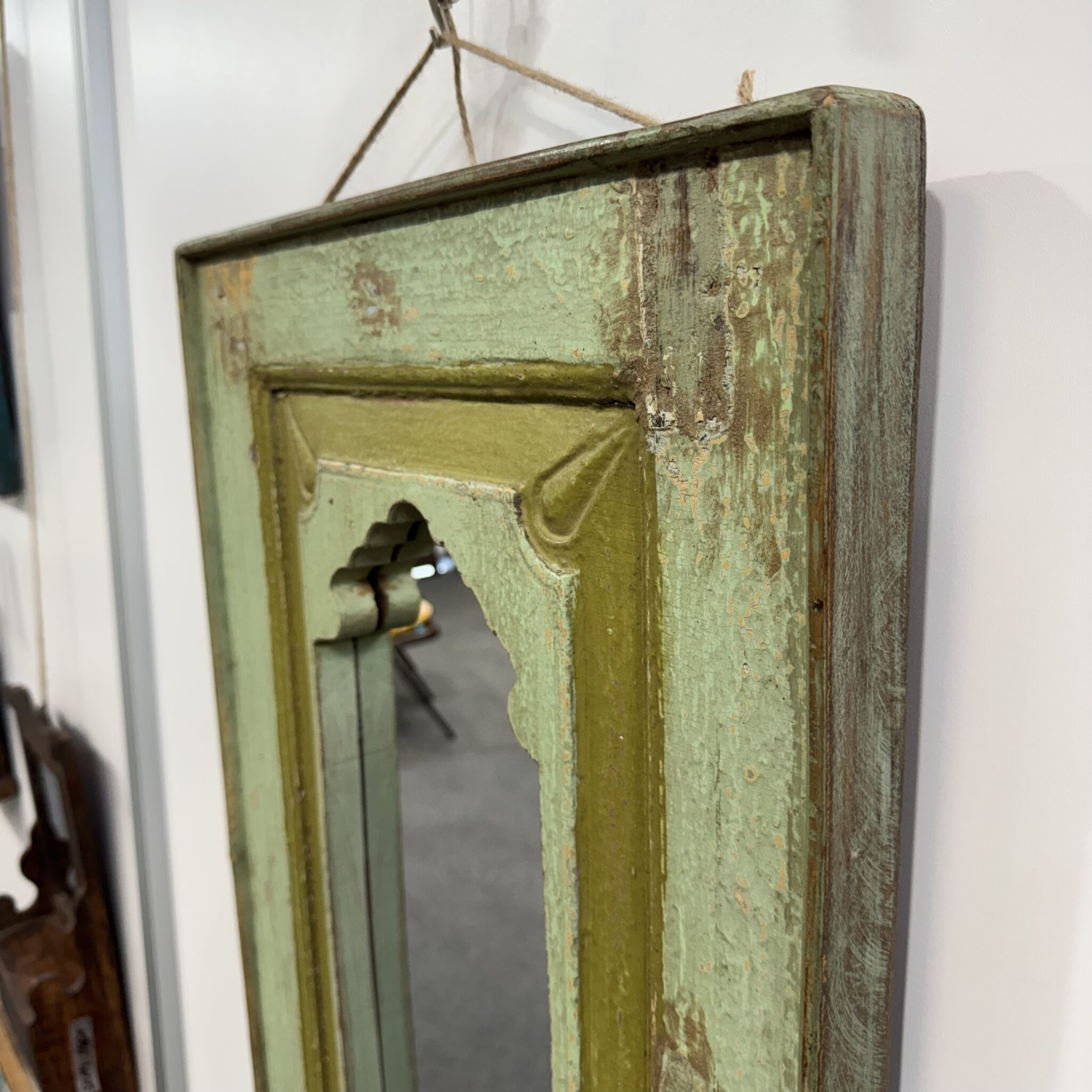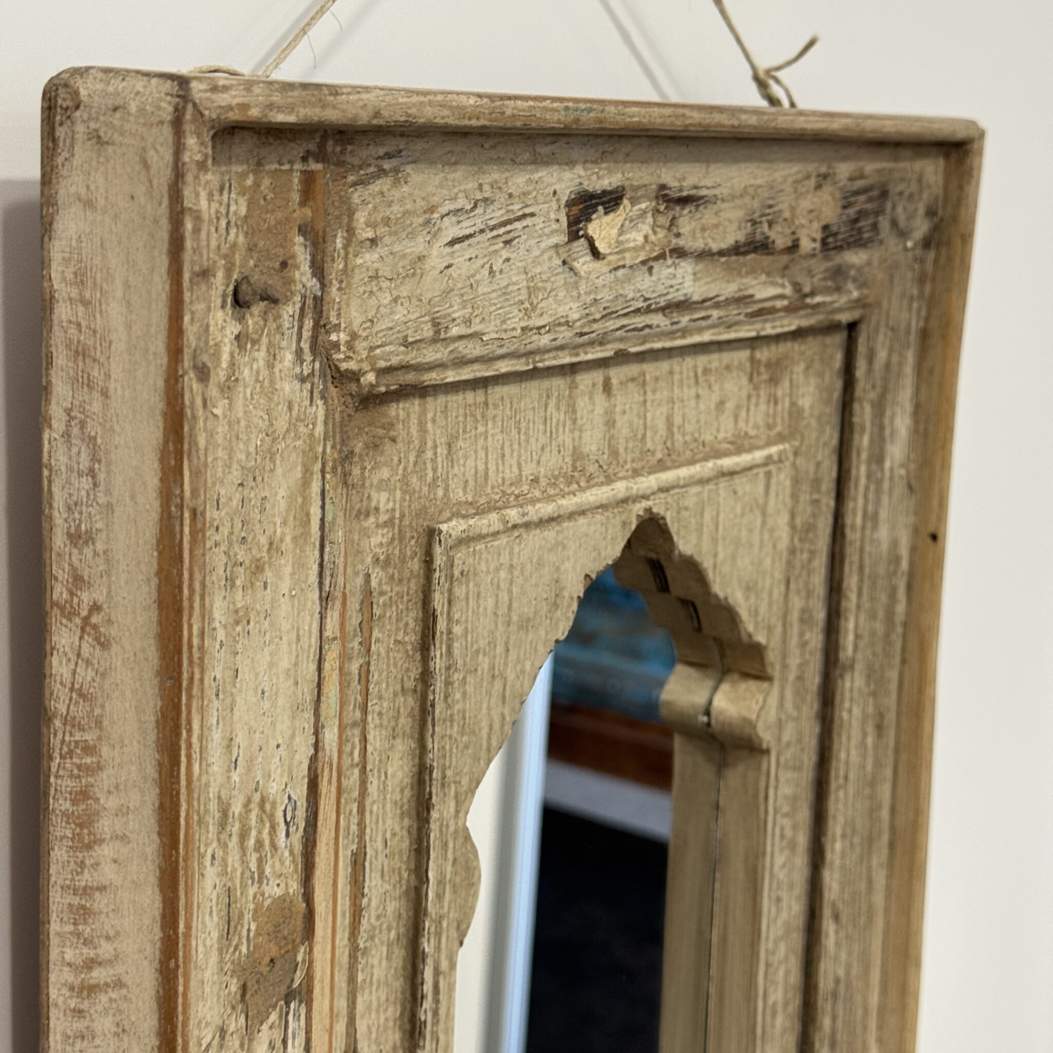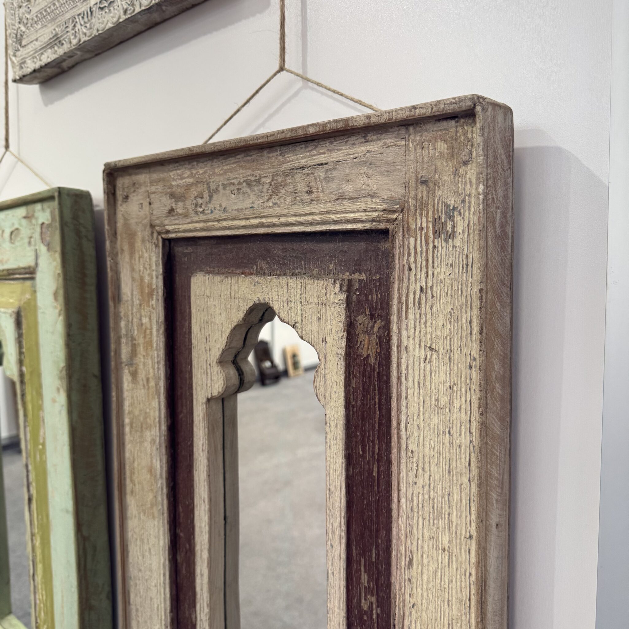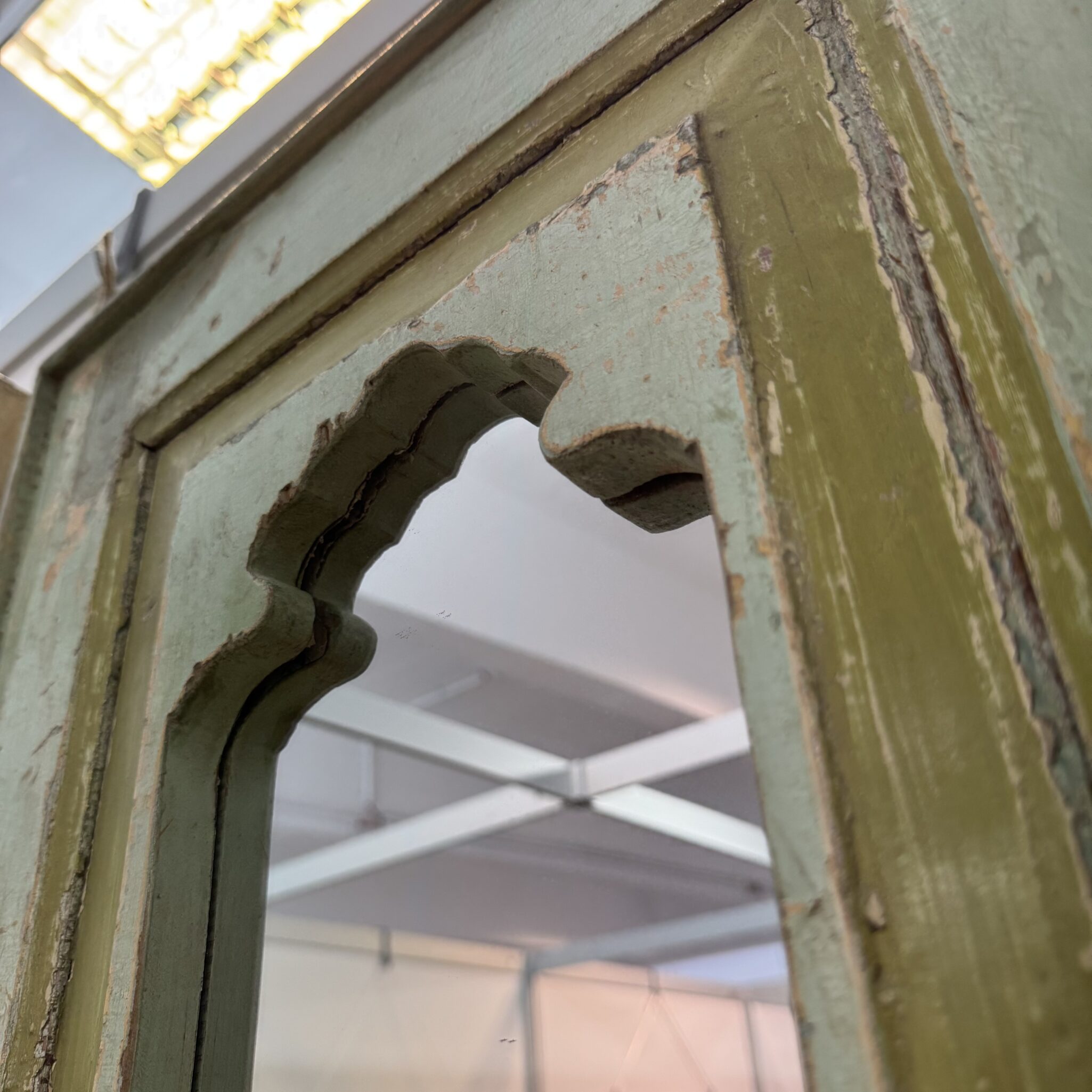 Besonders hervorzuheben sind die feinen, handgeschnitzten Details am oberen Rand. Diese filigranen Bögen sind typisch für die indische Architektur. Sie erinnern an prunkvolle Paläste aus Tausendundeiner Nacht. Dadurch wird der Spiegel zu einem echten Blickfang. Er reflektiert nicht nur das Licht, sondern auch eine ferne Kultur. Zudem lässt er kleine Räume optisch größer wirken. Nutzen Sie das Unikat Spiegel, um Akzente zu setzen. Er eignet sich hervorragend für den Flur, das Wohnzimmer oder Schlafzimmer. Vertrauen Sie auf die Qualität von Indian Living.