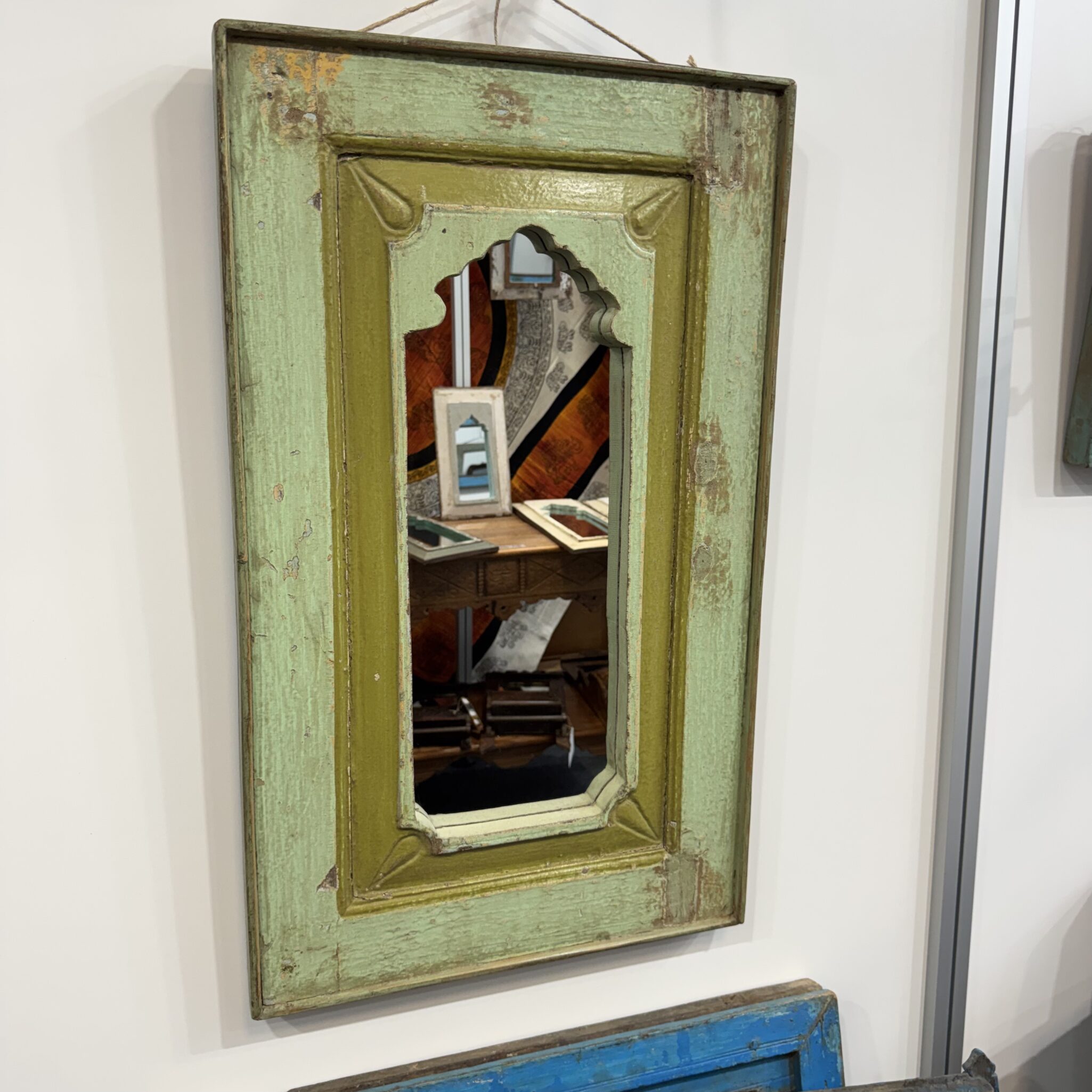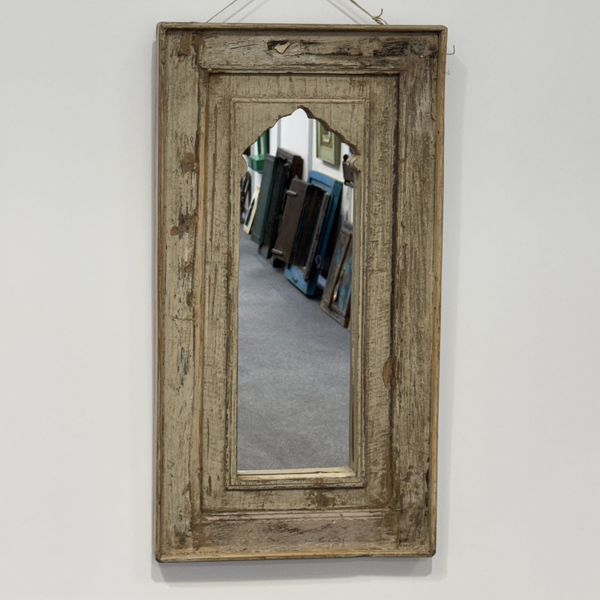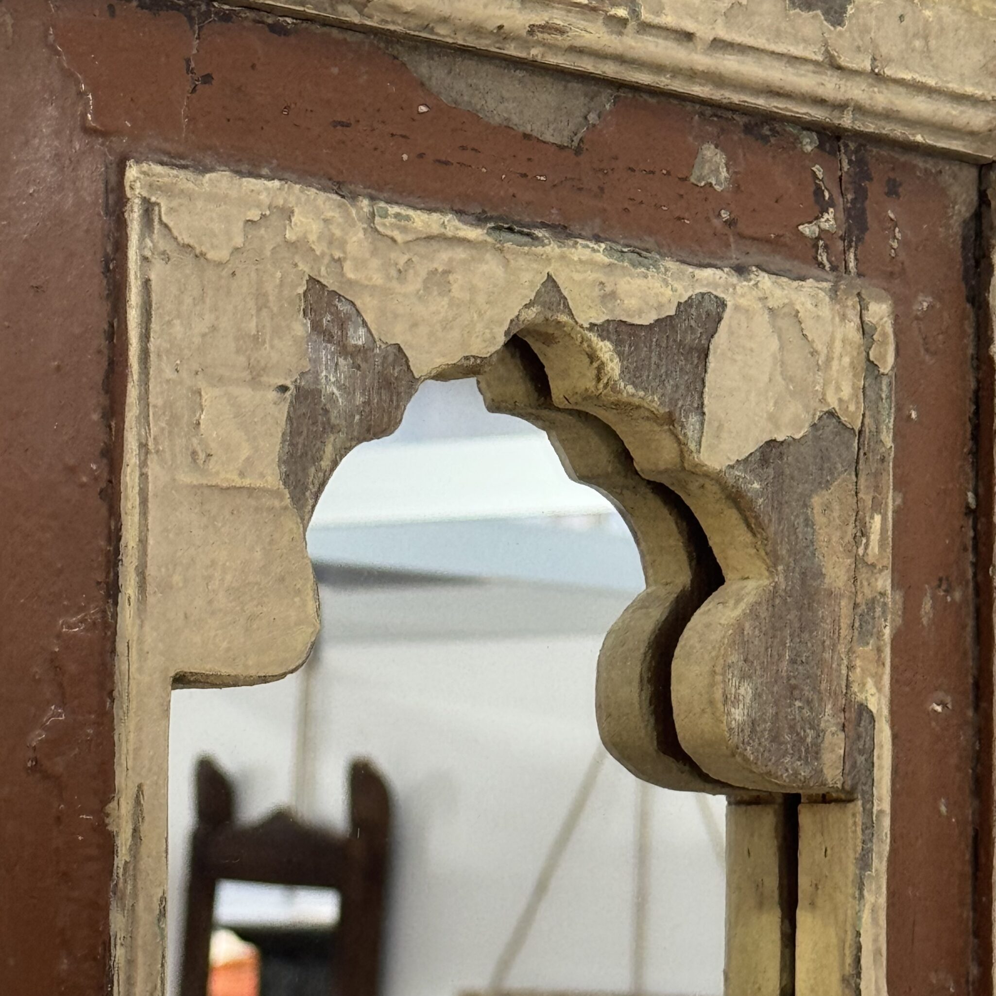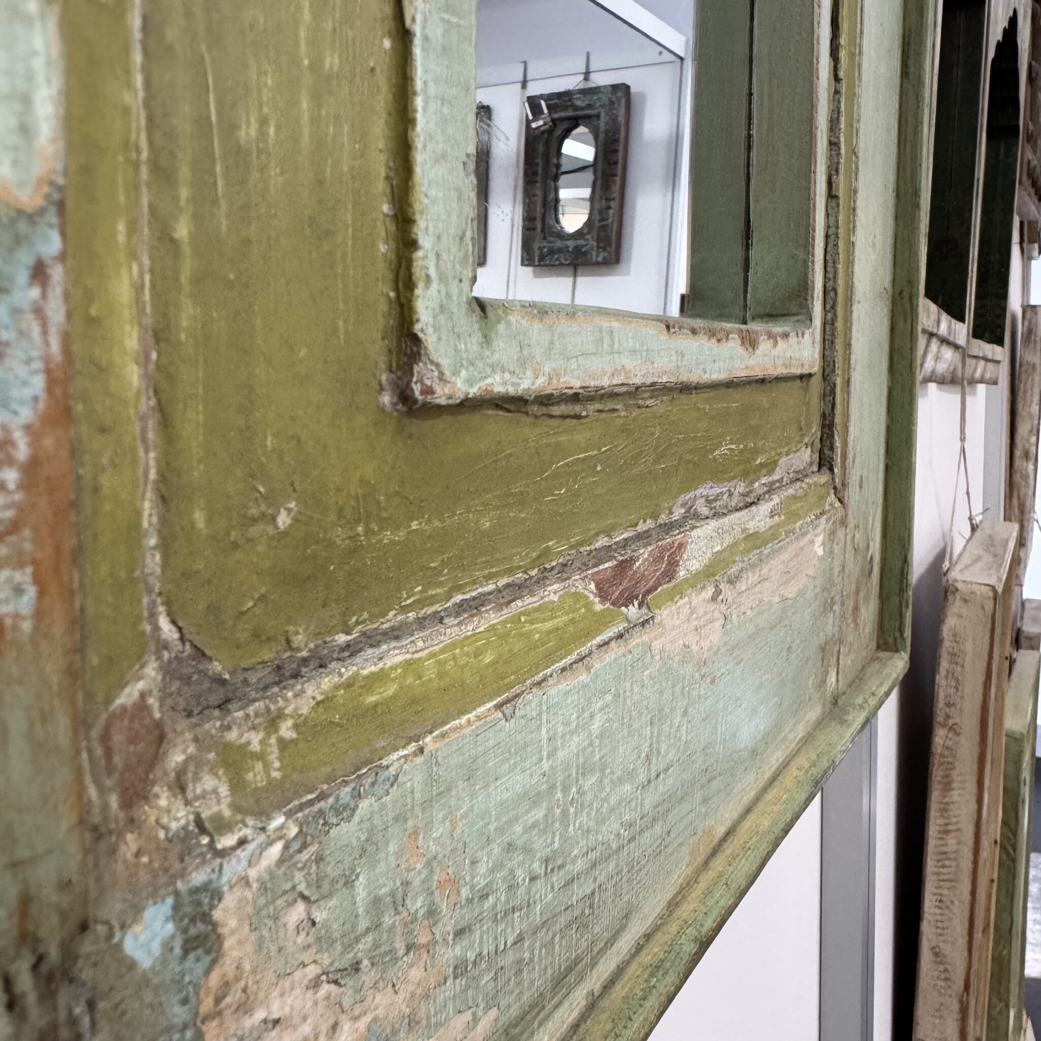 Besonders hervorzuheben sind die feinen, handgeschnitzten Details am oberen Rand. Diese filigranen Bögen sind typisch für die indische Architektur. Sie erinnern an prunkvolle Paläste aus Tausendundeiner Nacht. Dadurch wird der Spiegel zu einem echten Blickfang. Er reflektiert nicht nur das Licht, sondern auch eine ferne Kultur. Zudem lässt er kleine Räume optisch größer wirken. Nutzen Sie das Unikat Spiegel, um Akzente zu setzen. Er eignet sich hervorragend für den Flur, das Wohnzimmer oder Schlafzimmer. Vertrauen Sie auf die Qualität von Indian Living.