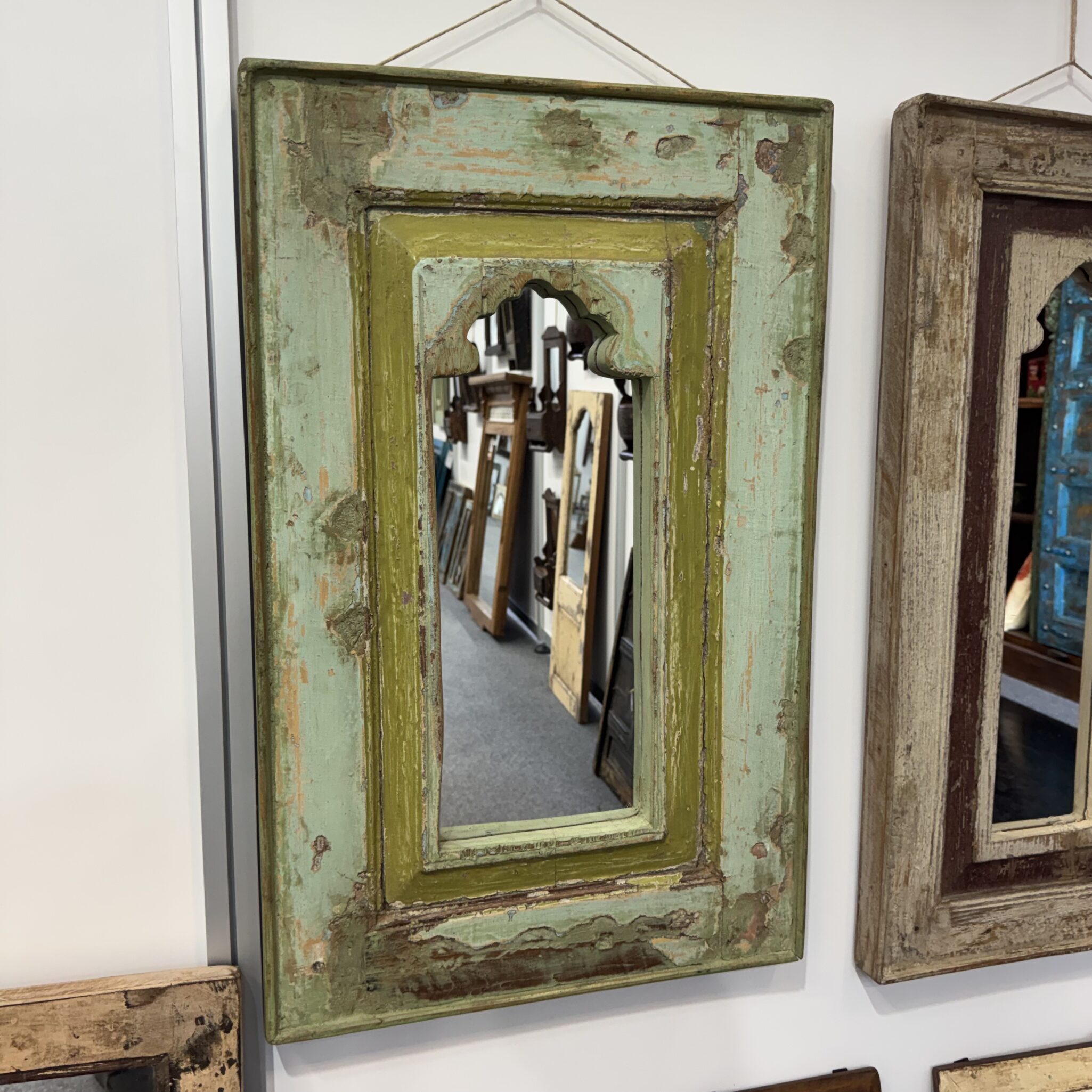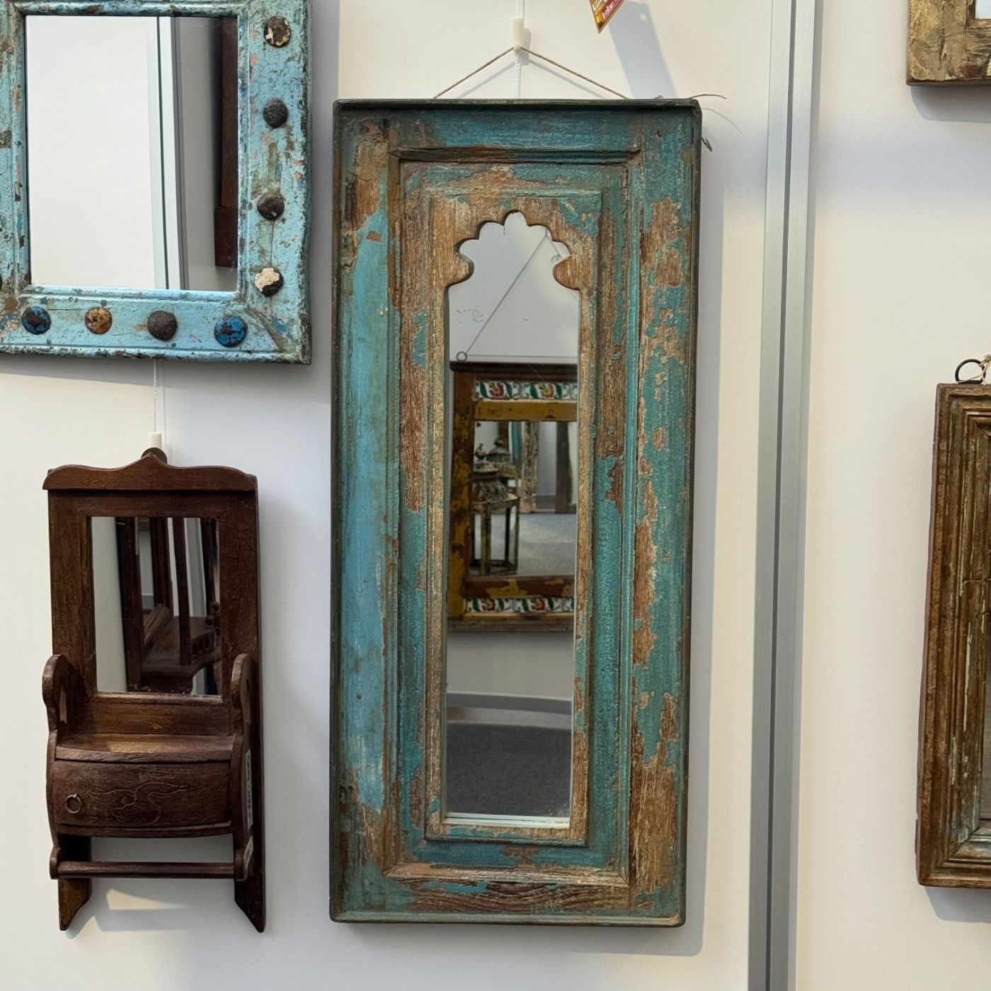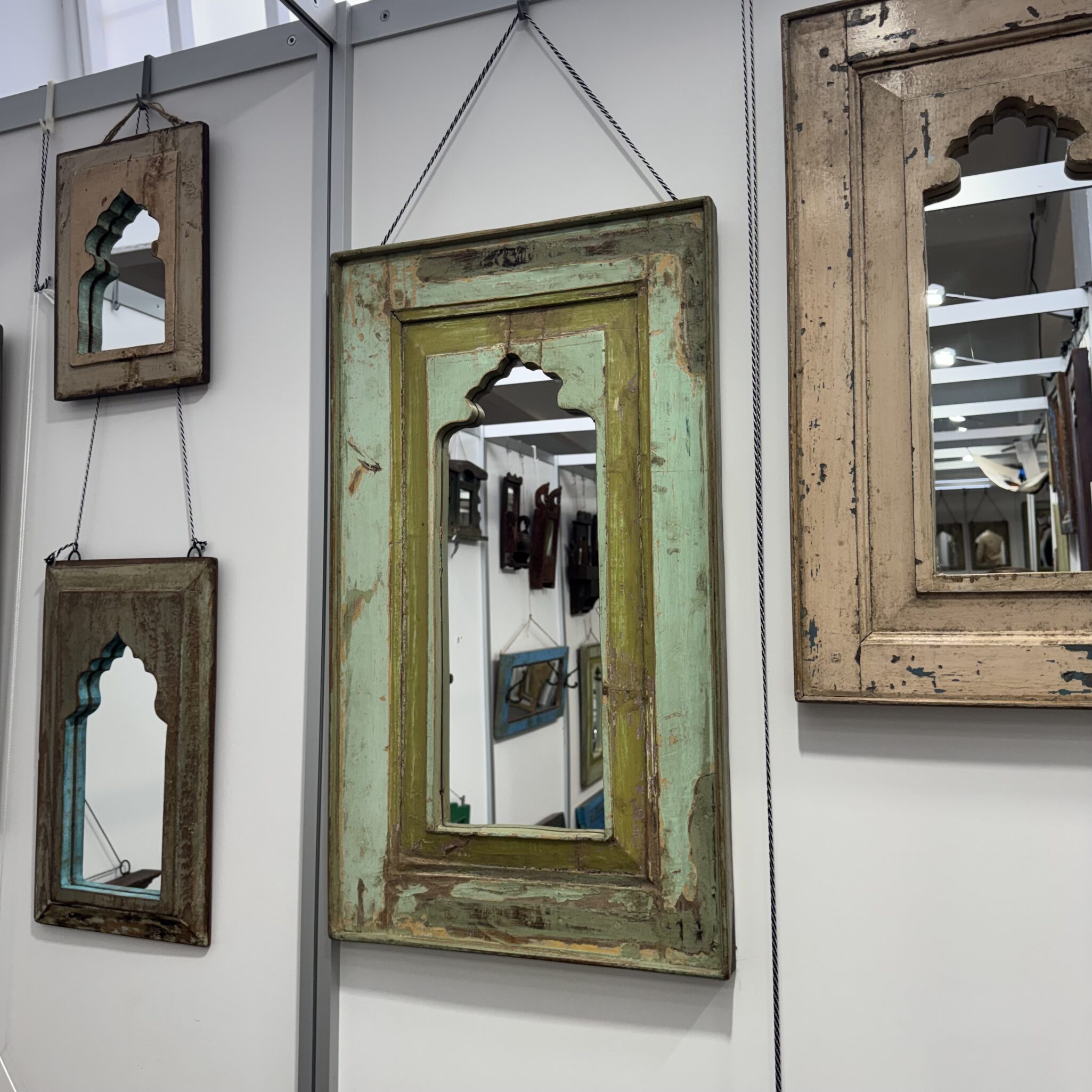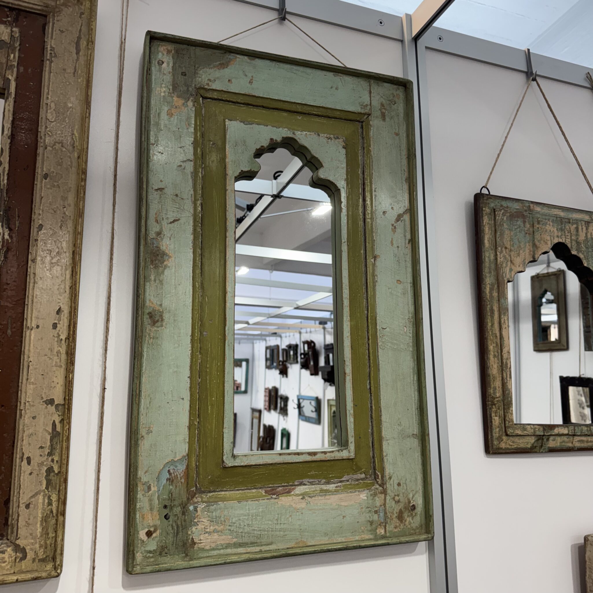 Besonders hervorzuheben sind die feinen, handgeschnitzten Details am oberen Rand. Diese filigranen Bögen sind typisch für die indische Architektur. Sie erinnern an prunkvolle Paläste aus Tausendundeiner Nacht. Dadurch wird der Spiegel zu einem echten Blickfang. Er reflektiert nicht nur das Licht, sondern auch eine ferne Kultur. Zudem lässt er kleine Räume optisch größer wirken. Nutzen Sie das Unikat Spiegel, um Akzente zu setzen. Er eignet sich hervorragend für den Flur, das Wohnzimmer oder Schlafzimmer. Vertrauen Sie auf die Qualität von Indian Living.