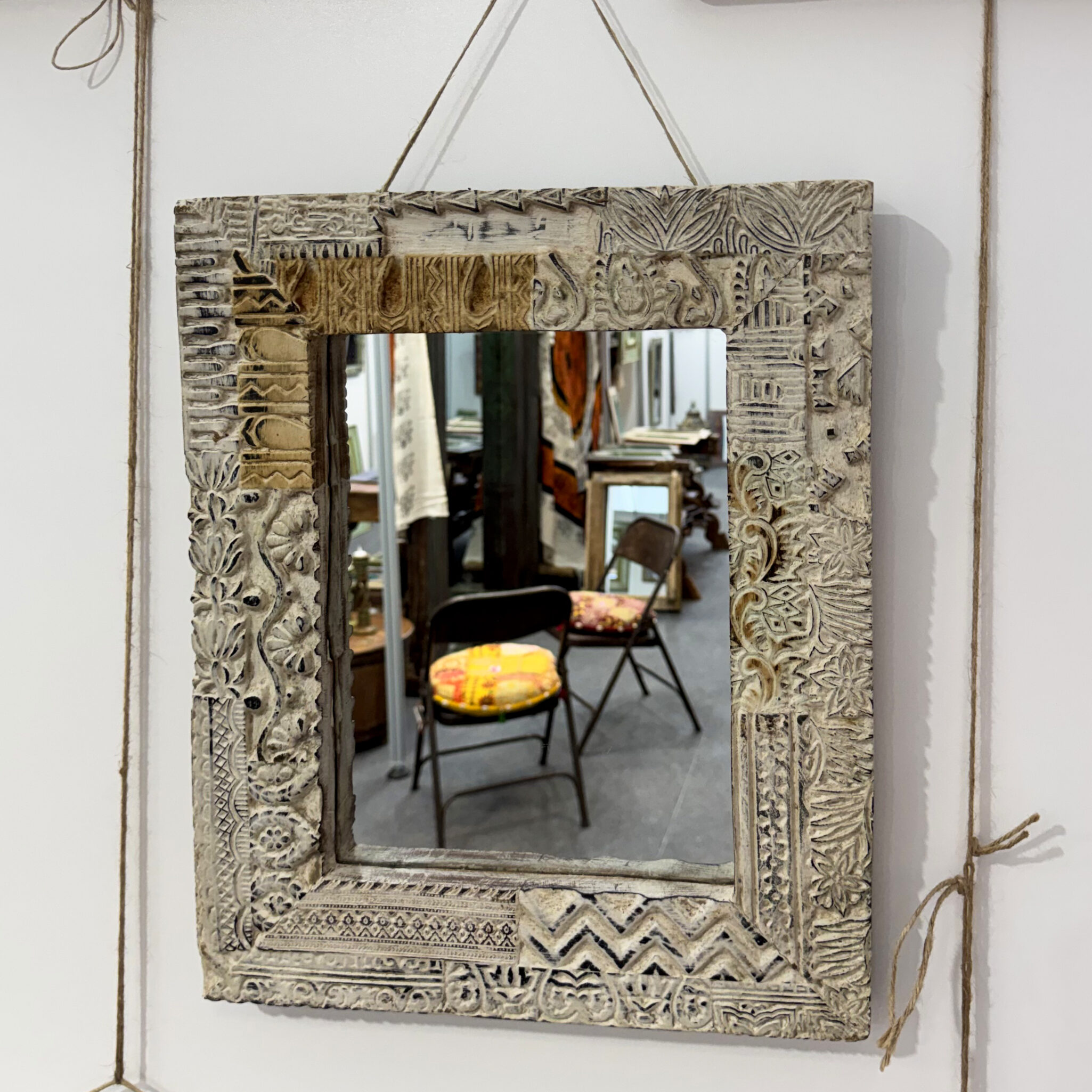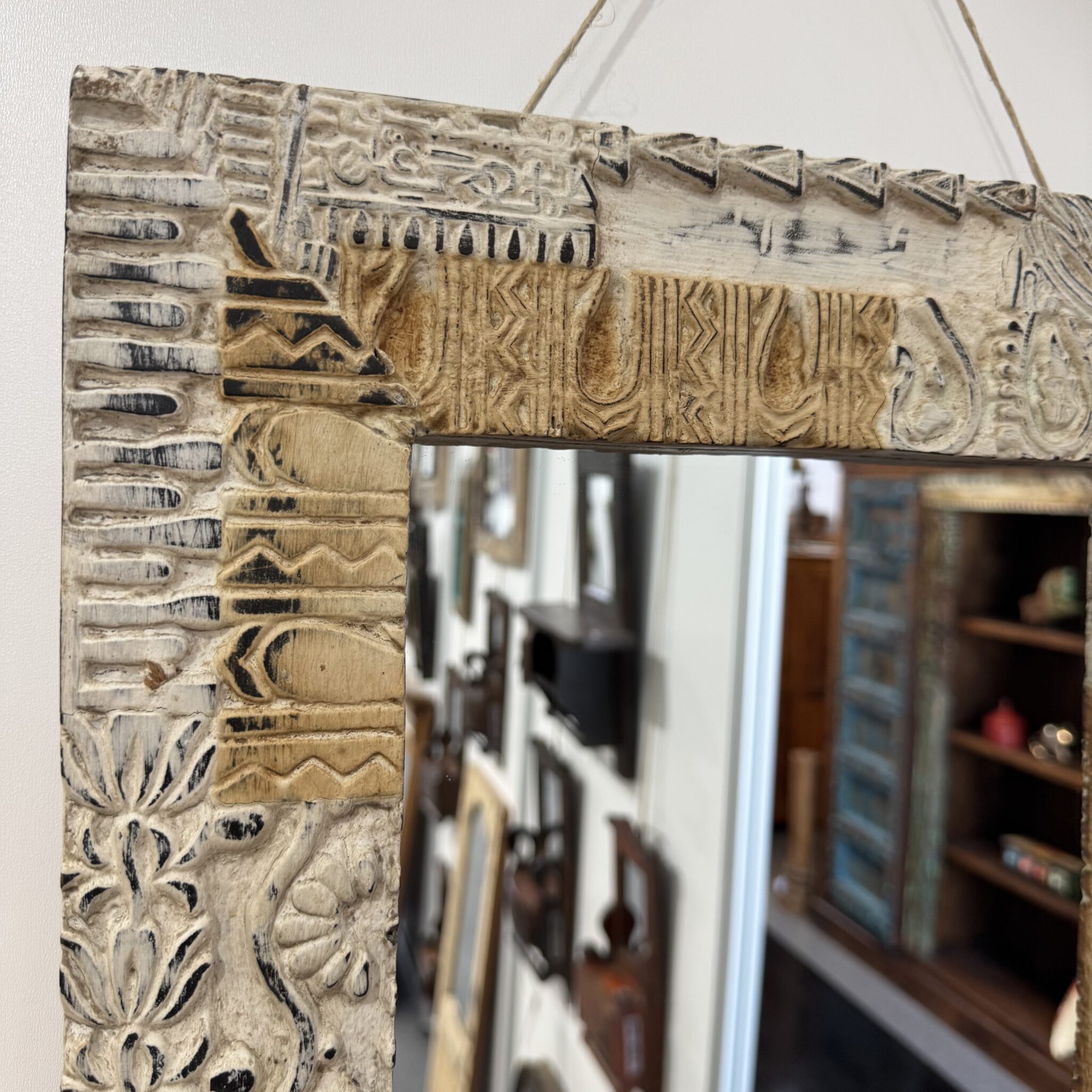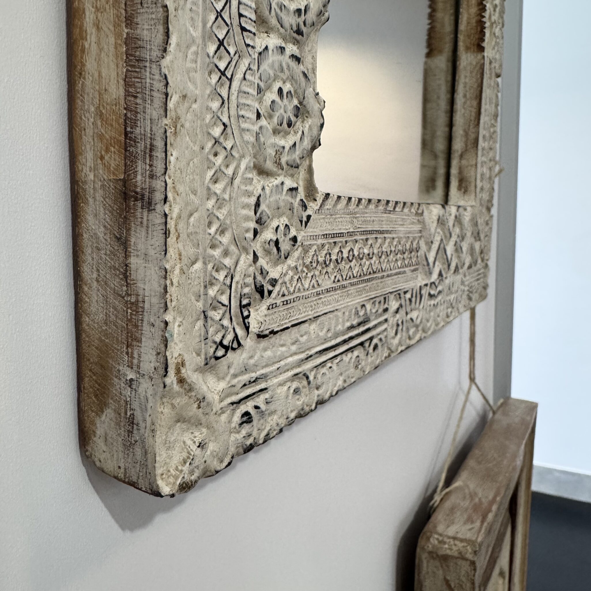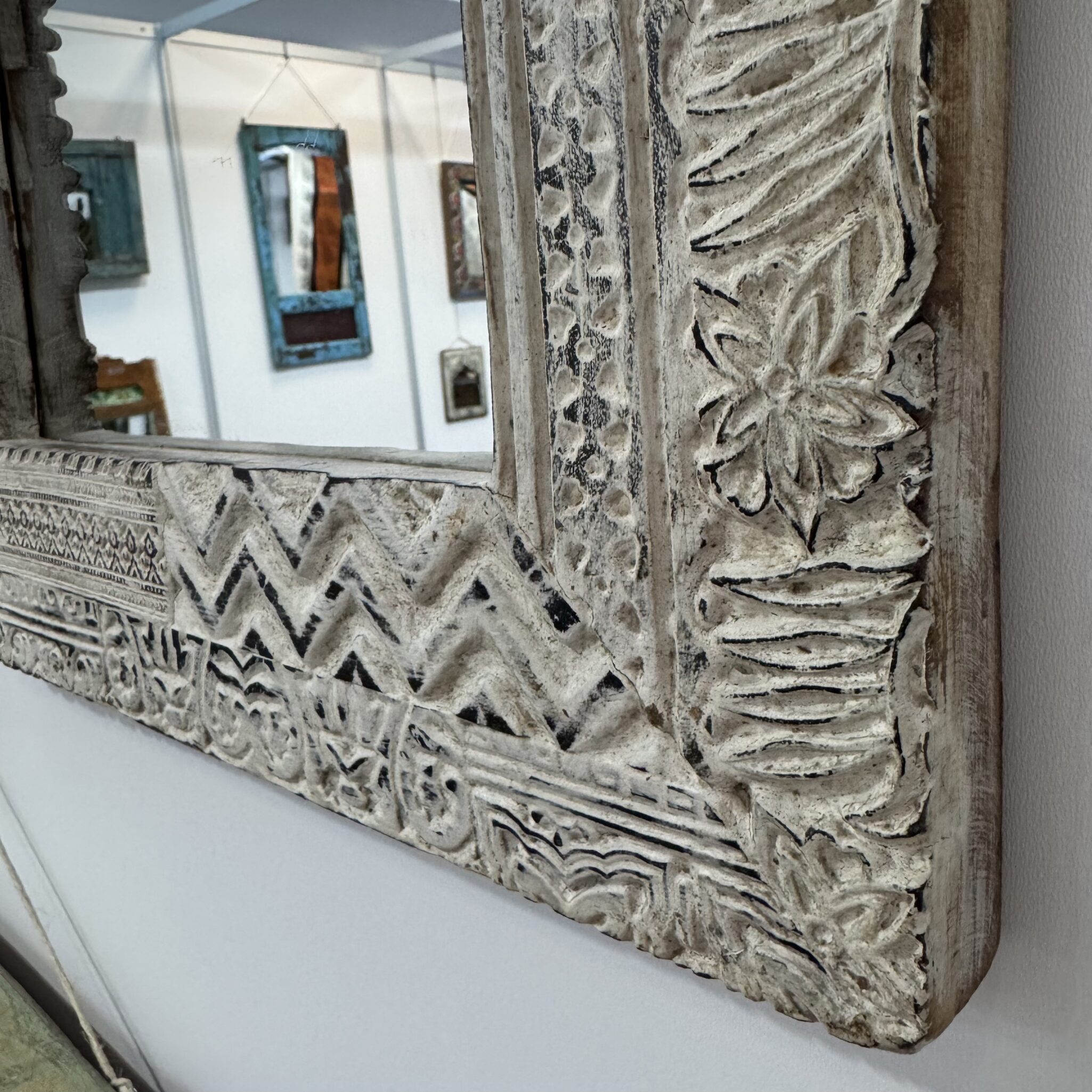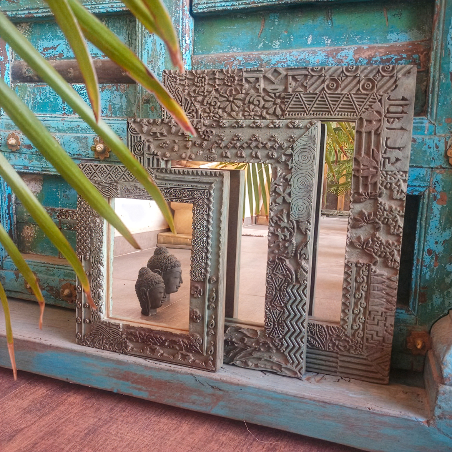 Bei der Herstellung dieser Spiegel steht die traditionelle Handwerkskunst im Vordergrund. Diese dekorativen Wandspiegel überzeugen durch ihre Holzrahmen mit authentischer, gewachsener Patina. Die lebendigen Farbschichten und natürlichen Gebrauchsspuren verleihen jedem Stück eine besondere Tiefe und unterstreichen den charaktervollen Vintage-Charme. Jeder Spiegel ist ein handgefertigtes Einzelstück und bringt eine besondere, individuelle Ausstrahlung in Ihren Wohnbereich oder das Schlafzimmer. Zudem schmücken dekorative, von Hand gesetzte Metallnieten den breiten Rahmen der Konstruktion. Deshalb ist dieses Modell ein wahres Unikat für Kenner von hochwertigem Ethno-Dekor. Durch die richtige Pflege dieser Oberflächen bleibt die natürliche Schönheit über viele Jahre hinweg perfekt erhalten. Somit sichern Sie sich ein langlebiges Kunstwerk für Ihre vier Wände.
