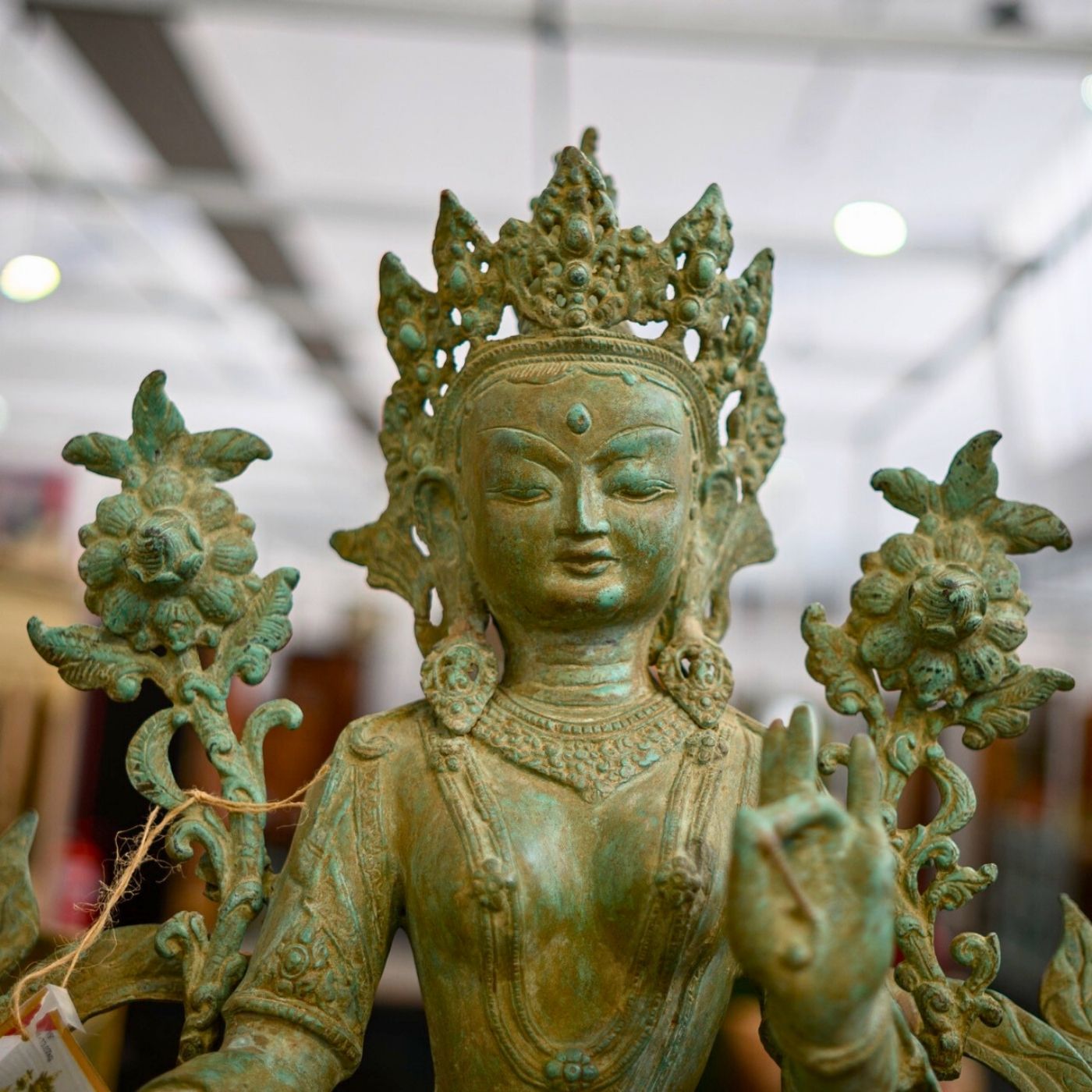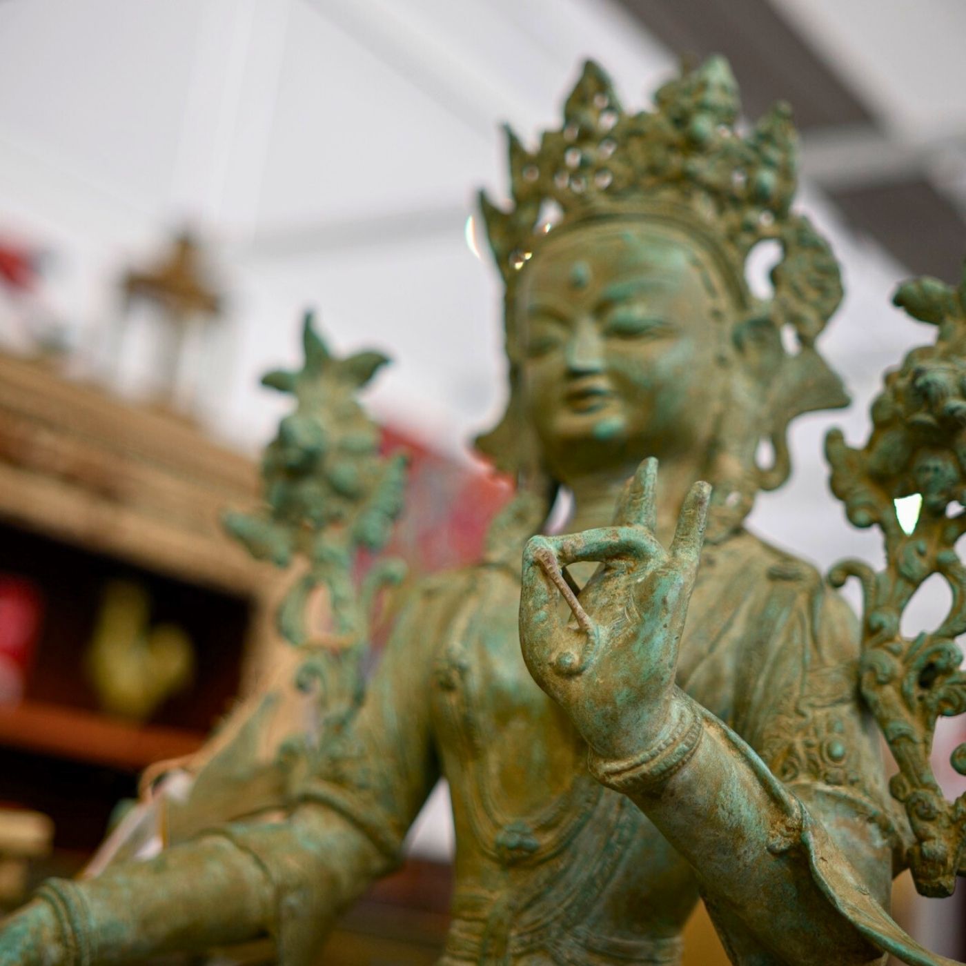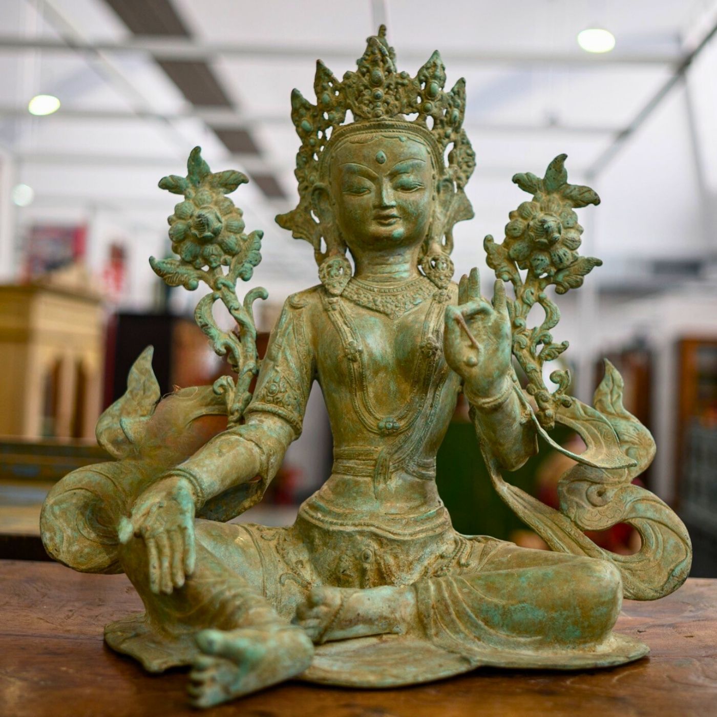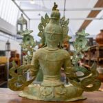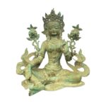Tara-Figur aus Messing mit fein ausgearbeiteten Details und natürlicher Patina. Die sitzende Darstellung und die filigranen Elemente verleihen der Figur eine ruhige, ausdrucksstarke Präsenz. Eine Tara-Figur stellt eine buddhistische Schutz- und Heilgöttin dar, die für Mitgefühl, Weisheit und spirituellen Beistand steht. Ideal als spirituelles Objekt oder dekorative Skulptur für Wohn- oder Meditationsbereiche.