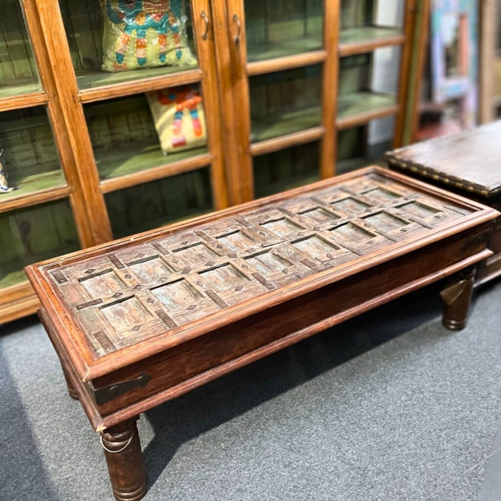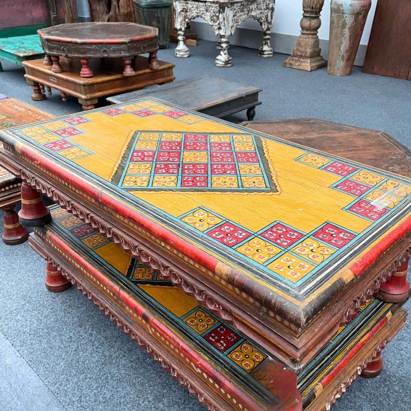 Die farbige Bemalung, die sichtbare Holzstruktur und die feinen Details verleihen dem Tisch eine warme, lebendige Ausstrahlung. Durch seine niedrige Höhe eignet er sich ideal als Bodentisch, Teetisch oder kleiner Couchtisch, ebenso als stilvoller Platz für Skulpturen, Kerzen oder einen persönlichen Hausaltar.