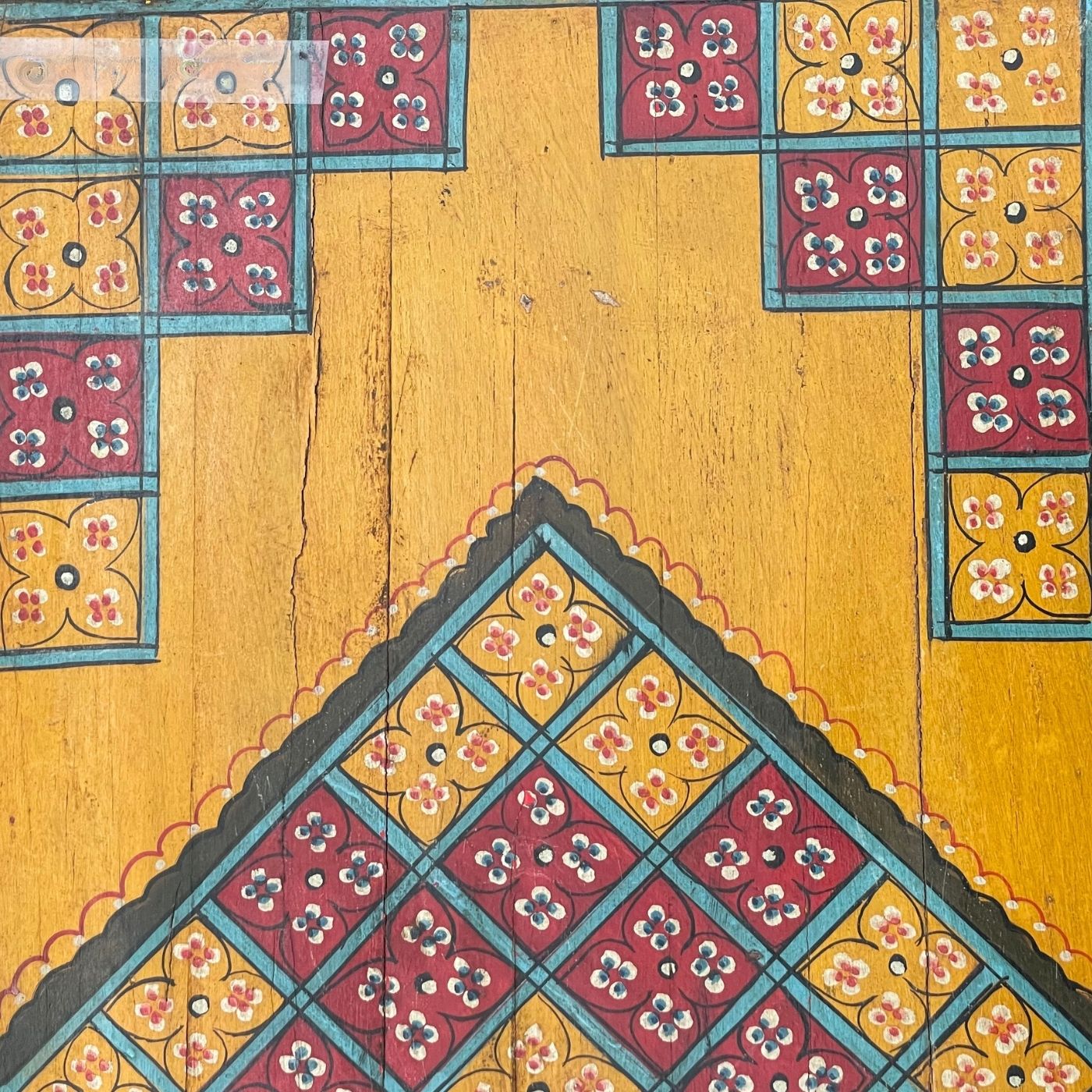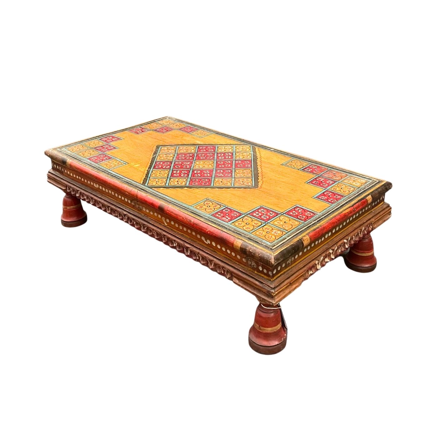 Dieser niedrige Bodentisch ist ein besonders ausdrucksstarkes Einzelstück aus Holz. Die Tischplatte ist von Hand mit einem traditionellen geometrischen Spielfeld-Motiv bemalt, wie es in Indien häufig sowohl dekorativ als auch symbolisch verwendet wurde.