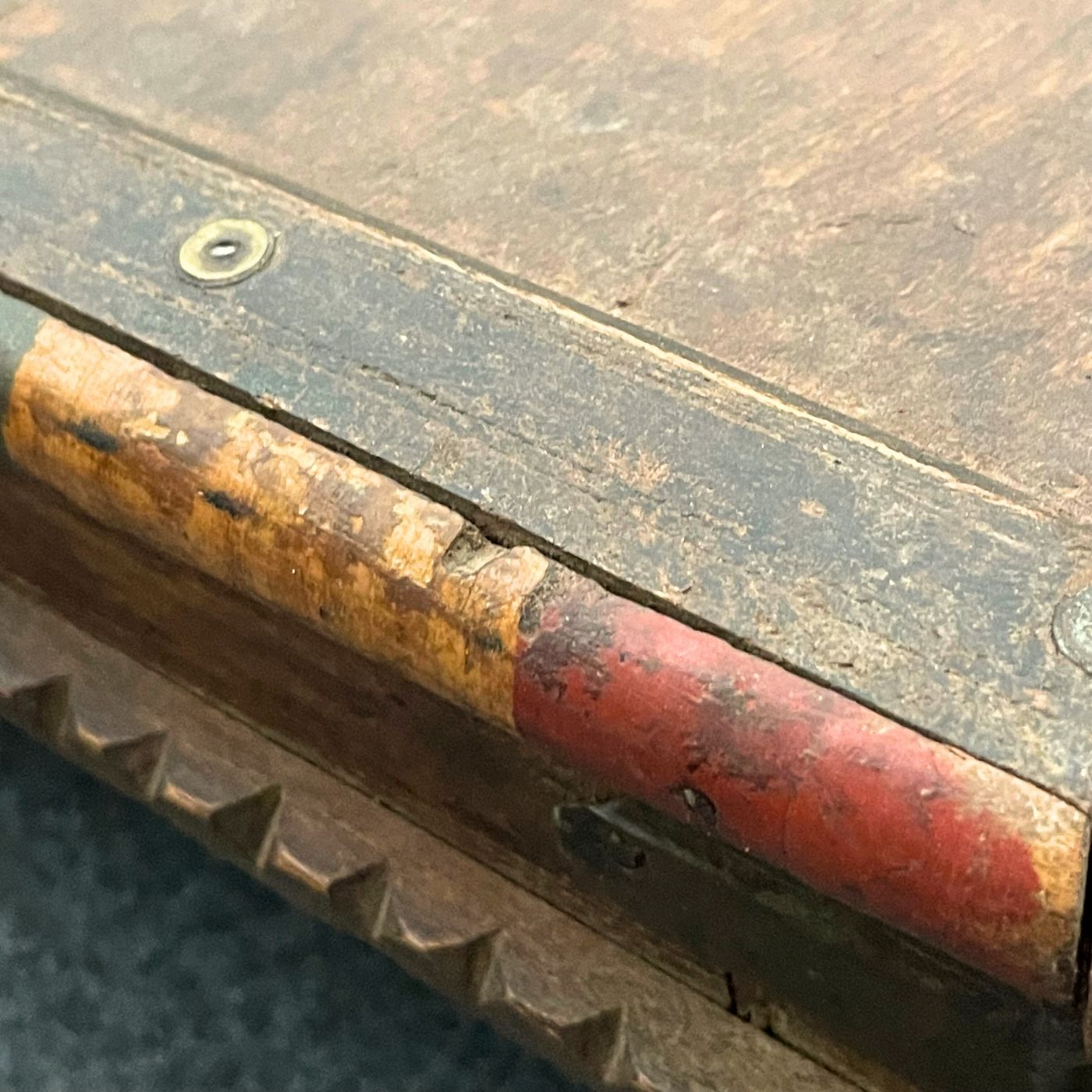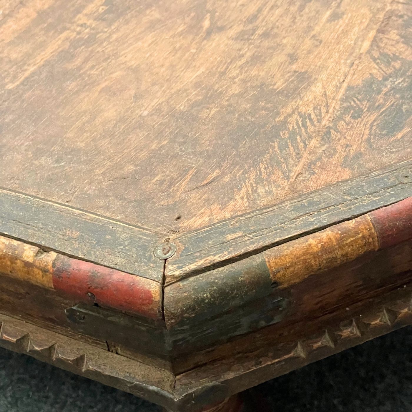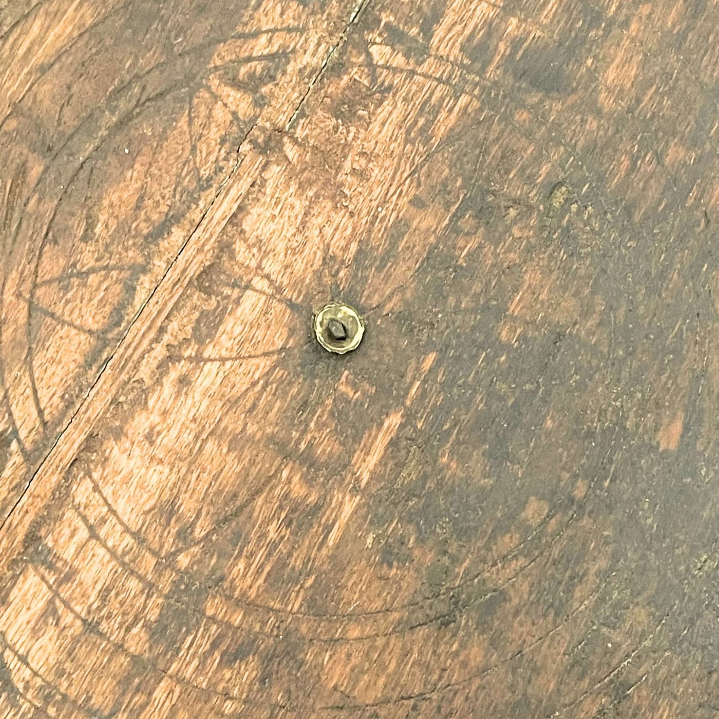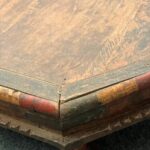 In der Tischfläche ist dezent ein ornamentales Motiv erkennbar, das an die Lebensblume erinnert und dem Tisch eine besondere, symbolische Tiefe verleiht. Die sichtbare Holzmaserung, Gebrauchsspuren und feine Farbakzente unterstreichen den authentischen Charakter und machen jedes Stück zu einem Unikat.