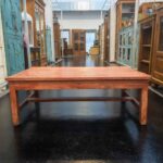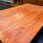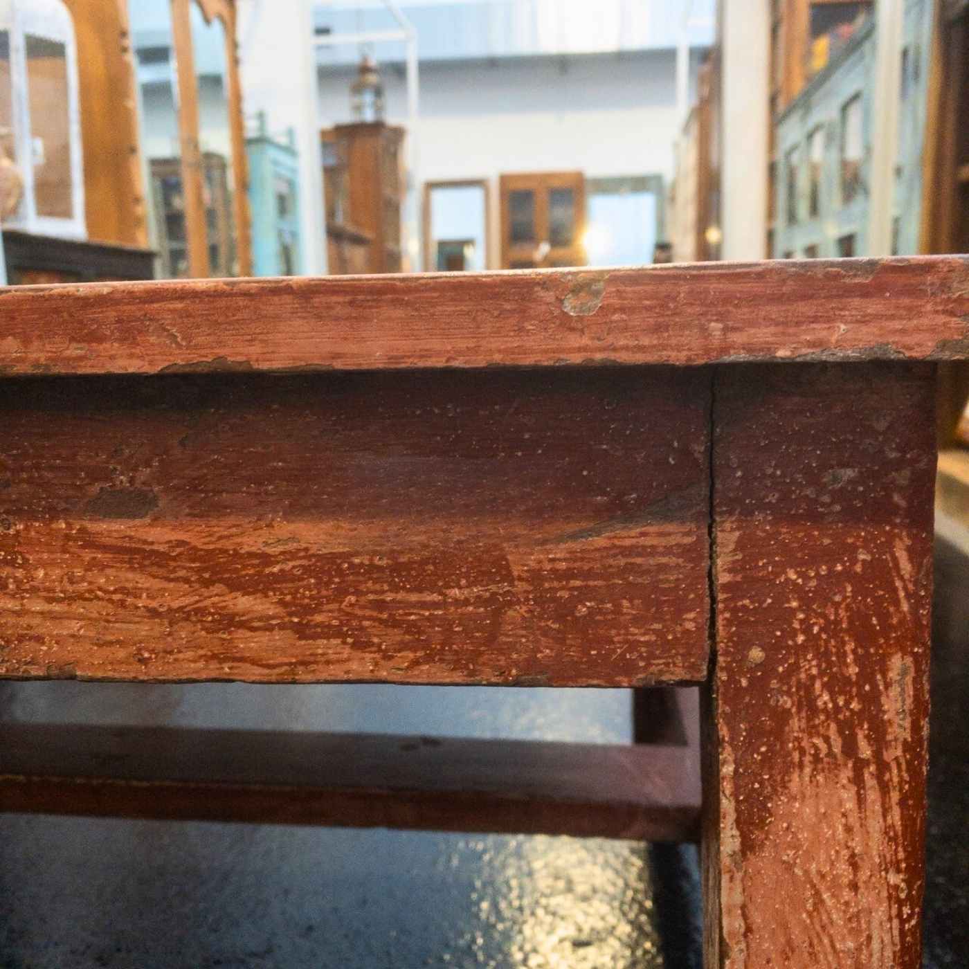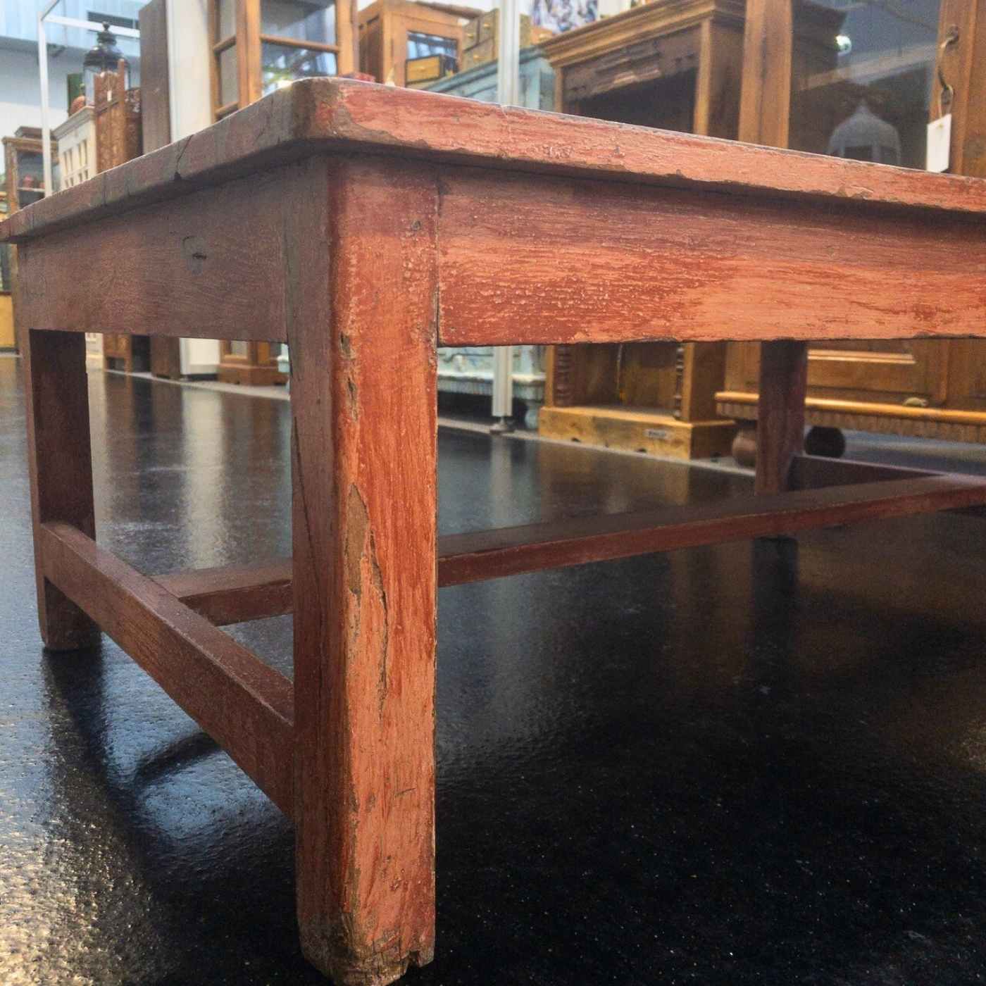 Dieser niedrige Tisch aus massivem Holz besticht durch seine schlichte, kraftvolle Form und die warme, rötliche Patina. Die großzügige Tischplatte und die stabile Bauweise verleihen ihm eine ruhige, ursprüngliche Ausstrahlung, während sichtbare Gebrauchsspuren den authentischen Charakter unterstreichen. Ein handgefertigtes Möbelstück mit viel Geschichte – vielseitig einsetzbar und mit natürlicher Präsenz.