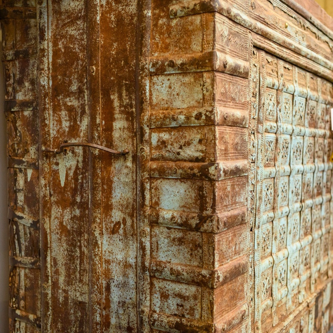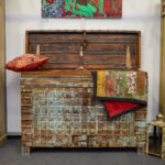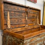 Truhe aus massivem Holz mit aufwendig gestalteter Front und charaktervoller, mehrschichtiger Oberfläche. Der stabile Deckel bietet großzügigen Stauraum für Decken, Textilien oder Alltagsgegenstände. Ein markantes Möbelstück für Wohn- oder Schlafbereiche.