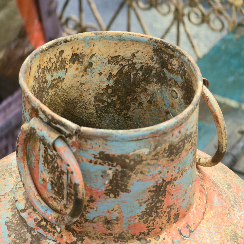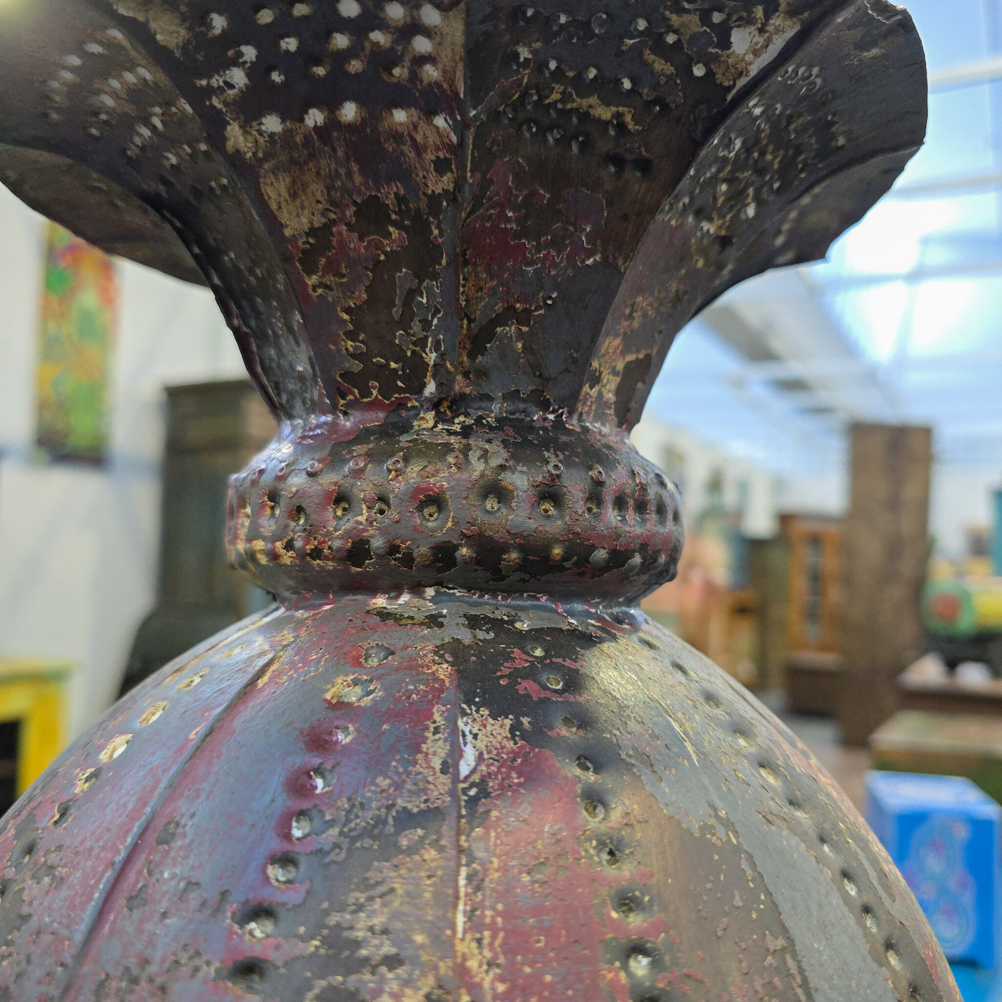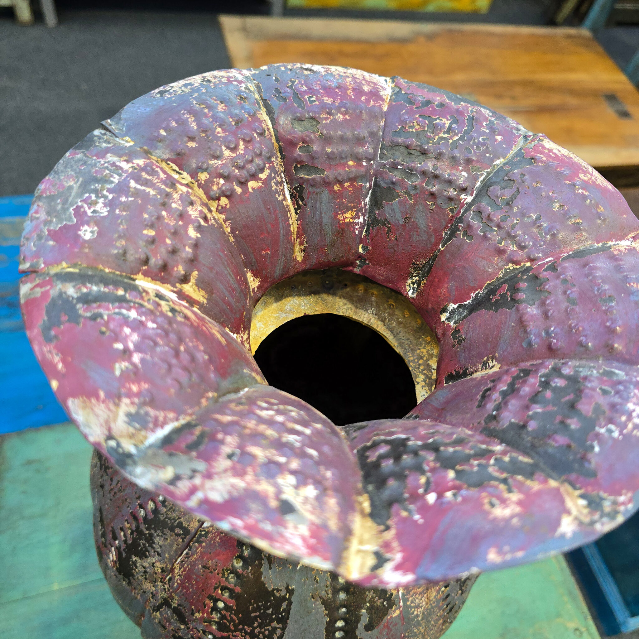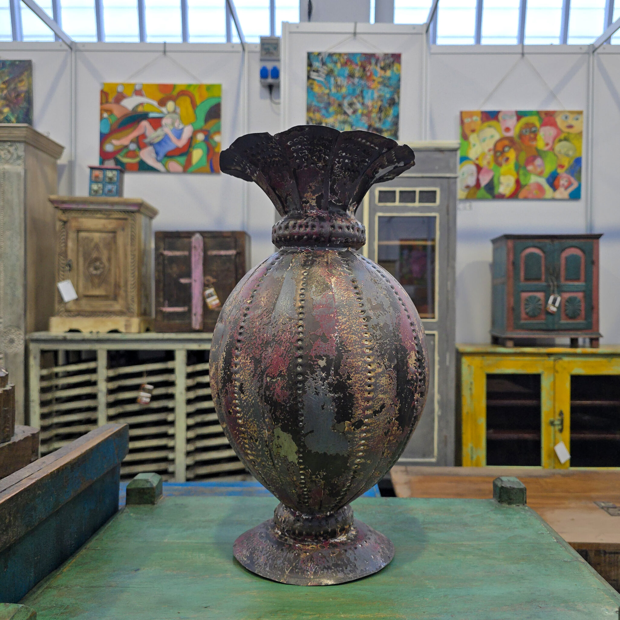 Der visuelle Reiz dieser Vase Eisen liegt in den gewollten Unvollkommenheiten der Oberfläche. Die feinen Farbakzente in Rost- und Goldtönen verleihen dem Eisen eine lebendige Ausstrahlung. Darüber hinaus erzählt jede Nuance von der traditionellen Herstellung dieses Einzelstücks. Diese Vase Eisen ist folglich die ideale Wahl für Liebhaber des Vintage-Stils. Die organische Formgebung harmoniert zudem wunderbar mit floralen Arrangements oder trockenen Zweigen. Deshalb fungiert das Objekt als vielseitiger Blickfang in modernen sowie klassischen Räumen. Somit kreieren Sie eine Atmosphäre, die sowohl Eleganz als auch Beständigkeit vermittelt. Jedes Detail dieser Vase Eisen wurde mit großer Leidenschaft für das Material Metall ausgearbeitet.