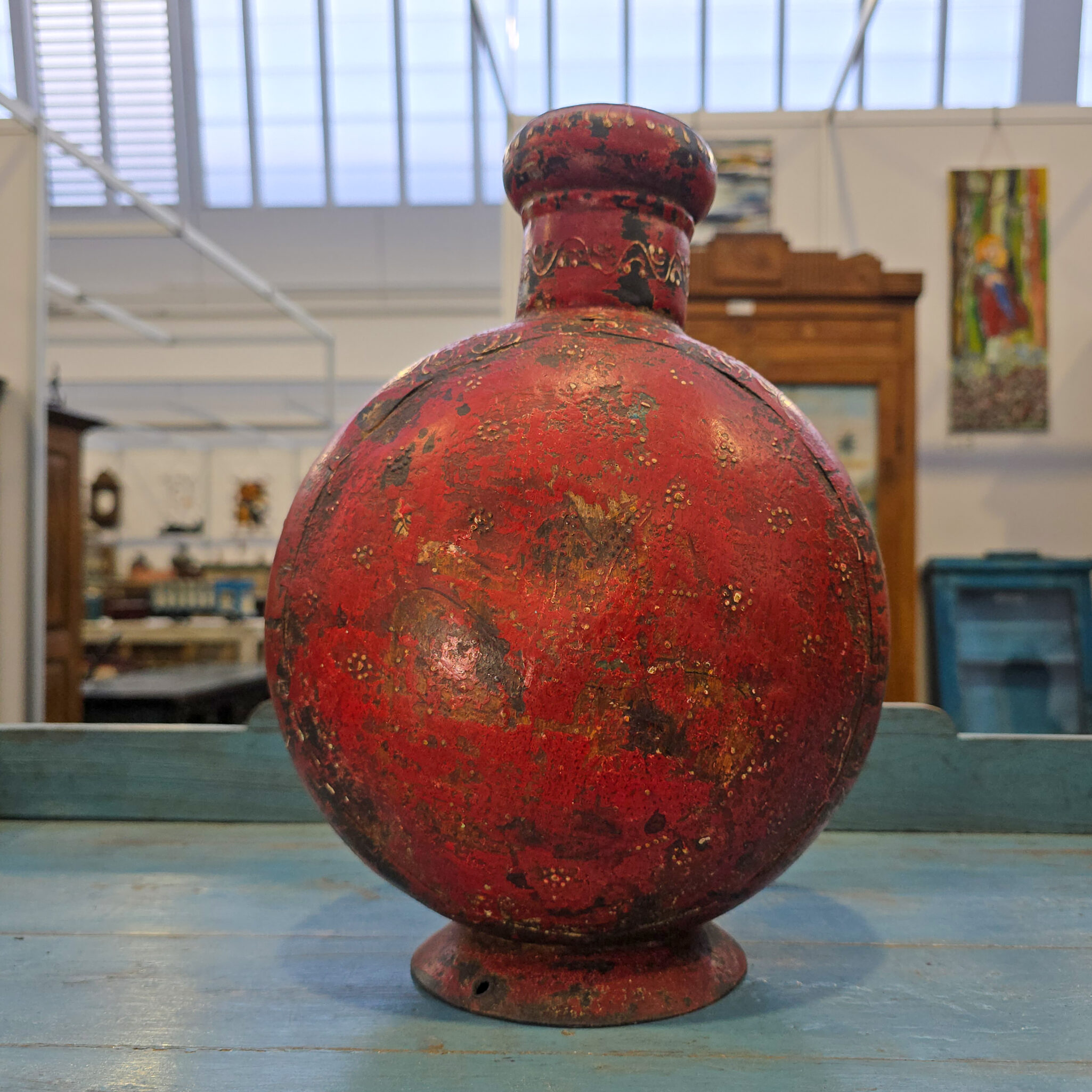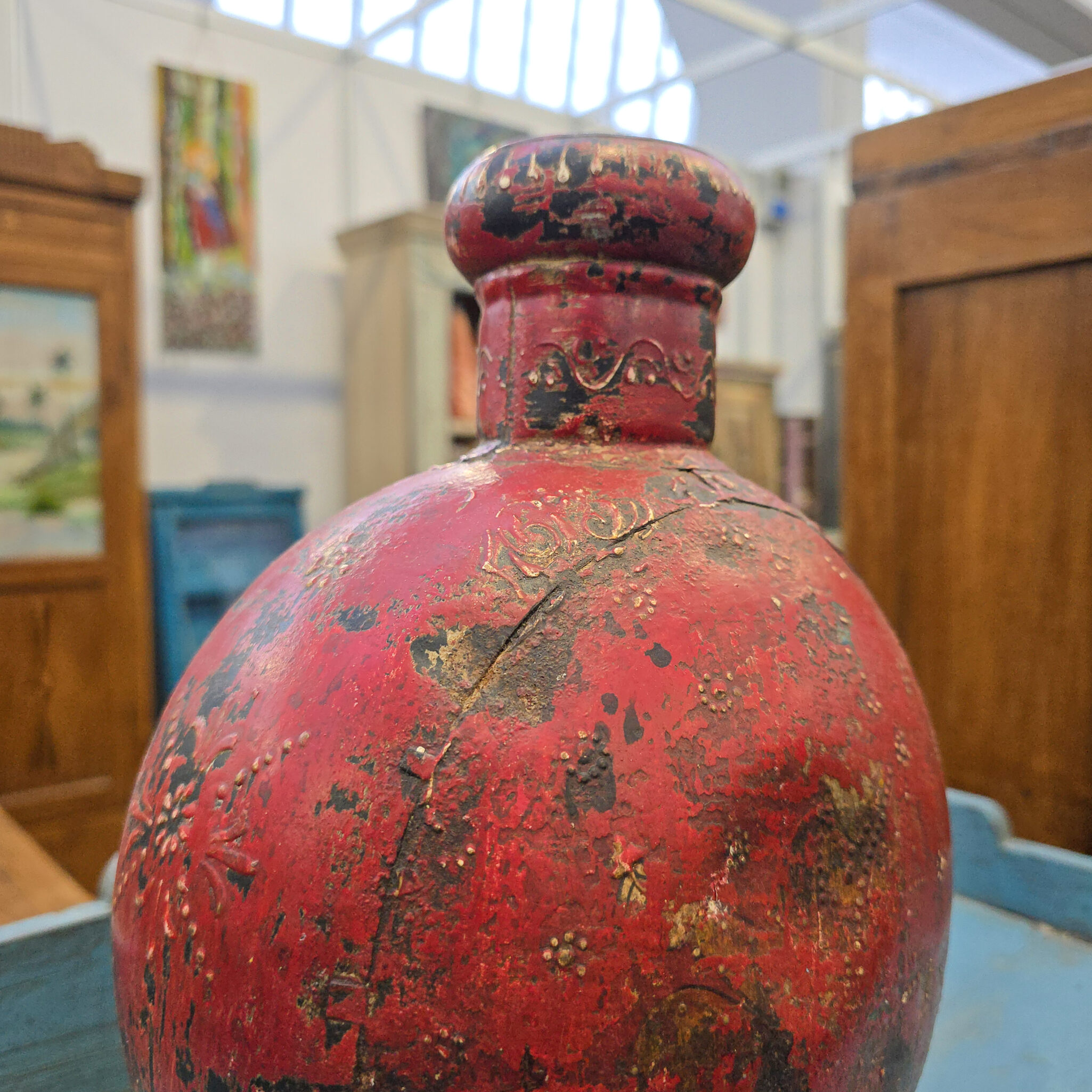 Diese exklusive Vase Eisen besticht durch ihre markante Präsenz und bringt eine warme, historische Note in Ihre Räume. Das intensive Rot ist kunstvoll mit einer antiken Patina versehen. Zudem verleihen die gewollten Unregelmäßigkeiten der Oberfläche dem Objekt einen unverwechselbaren Charakter. Deshalb eignet sich die Vase Eisen hervorragend als dekoratives Highlight auf einem Sideboard oder einer Fensterbank. Darüber hinaus harmoniert das rustikale Design wunderbar mit modernen sowie klassischen Einrichtungsstilen. Folglich setzt dieses Dekorationsobjekt in jedem Raum einen stilvollen Akzent. Somit erwerben Sie ein handgefertigtes Einzelstück mit einer ganz besonderen Ausstrahlung.