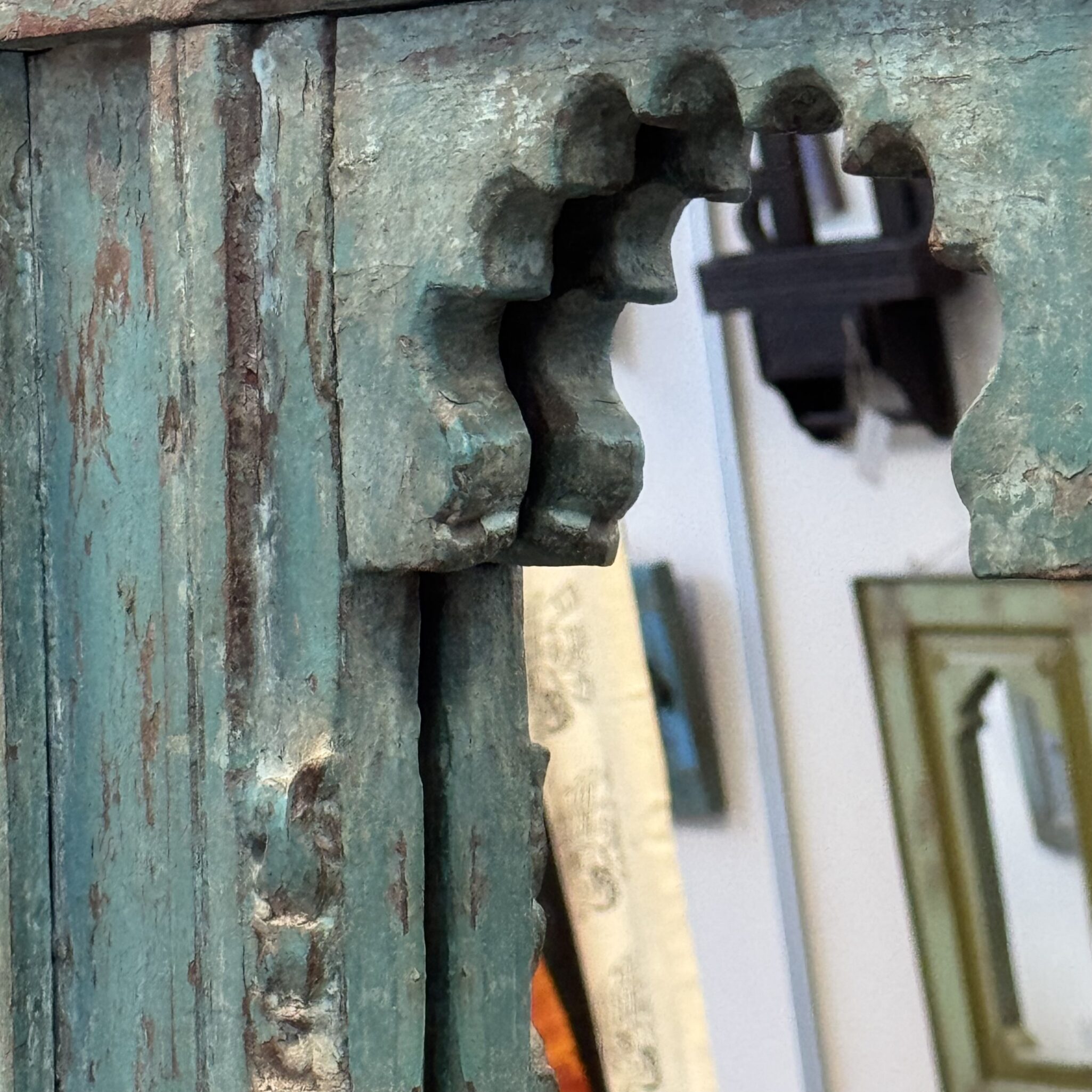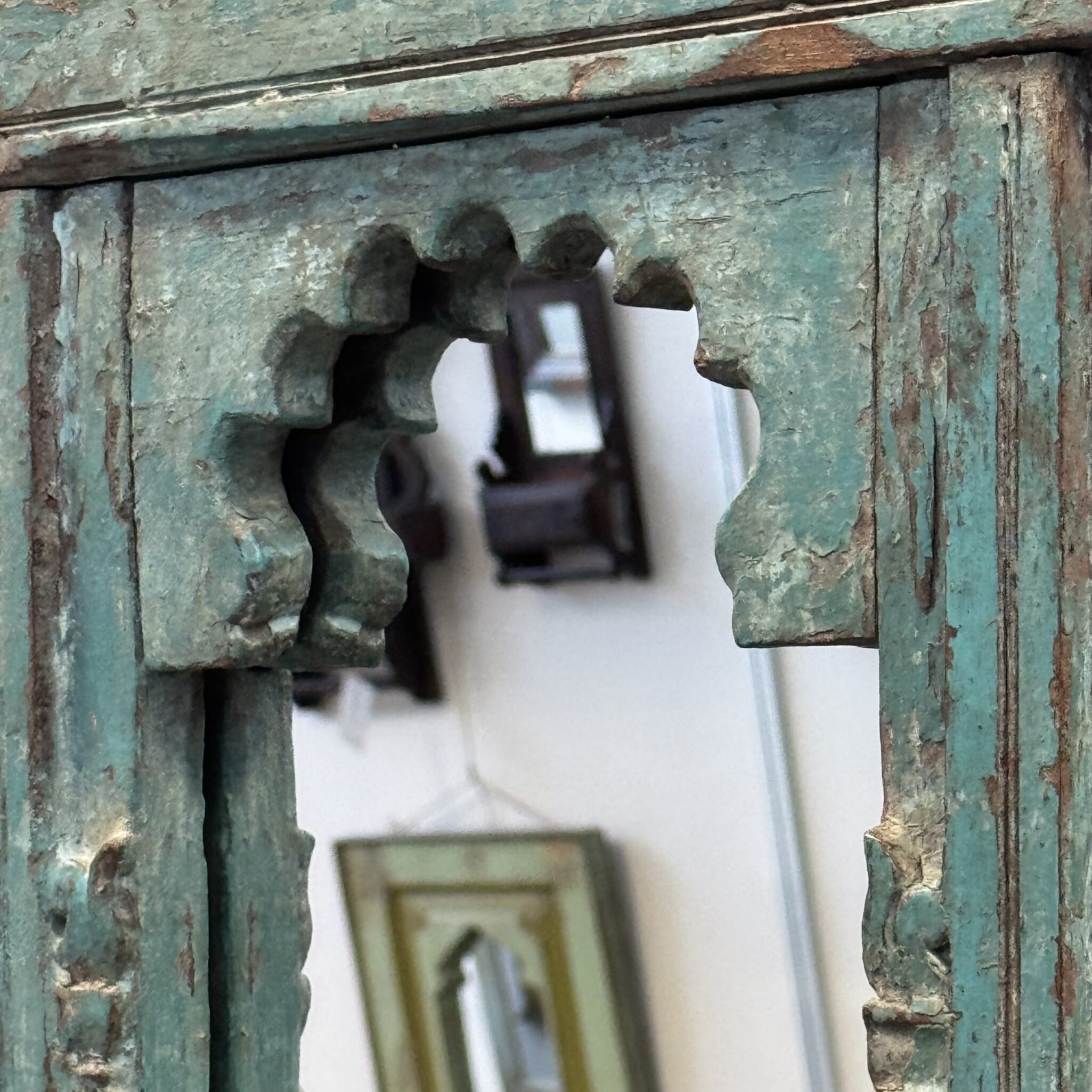 Besonders hervorzuheben ist die markante türkis-blaue Patina des Rahmens. Diese lebendige Farbe lässt den Vintage Spiegel in Türkis sofort ins Auge fallen. Die Form erinnert an traditionelle indische Architektur. Sie bringt einen Hauch von Exotik in Ihre vier Wände. Dadurch wird der Spiegel zu einem echten Highlight. Er reflektiert nicht nur das Licht, sondern auch eine ferne Kultur. Zudem lässt er kleine Räume optisch größer wirken. Nutzen Sie dieses Unikat, um Akzente zu setzen. Er eignet sich hervorragend für den Flur, das Wohnzimmer oder Schlafzimmer. Vertrauen Sie auf die Qualität von Indian Living.
