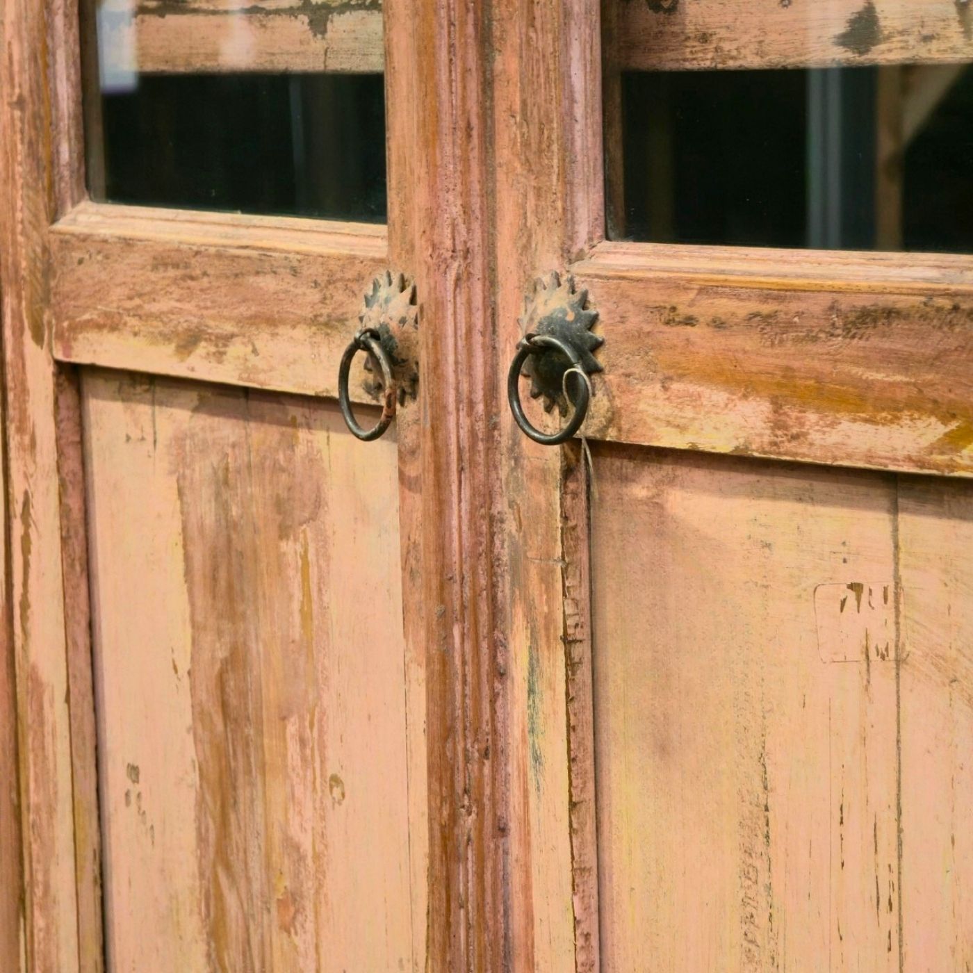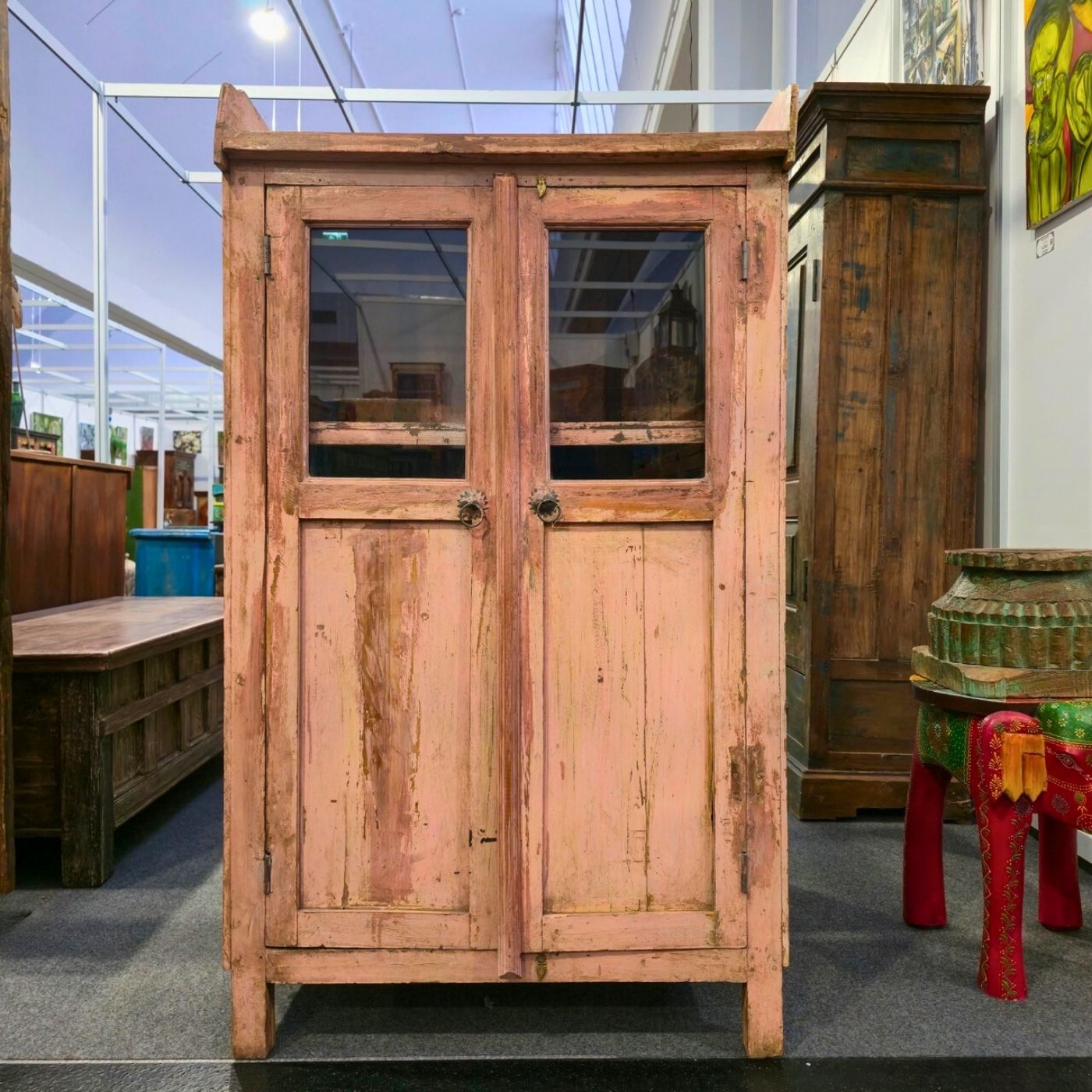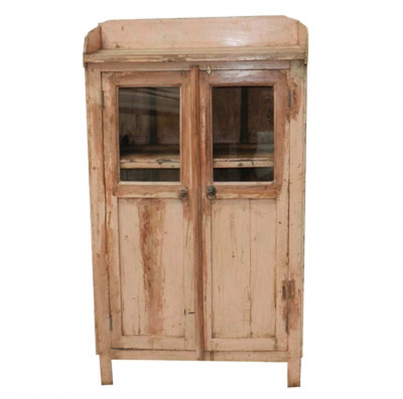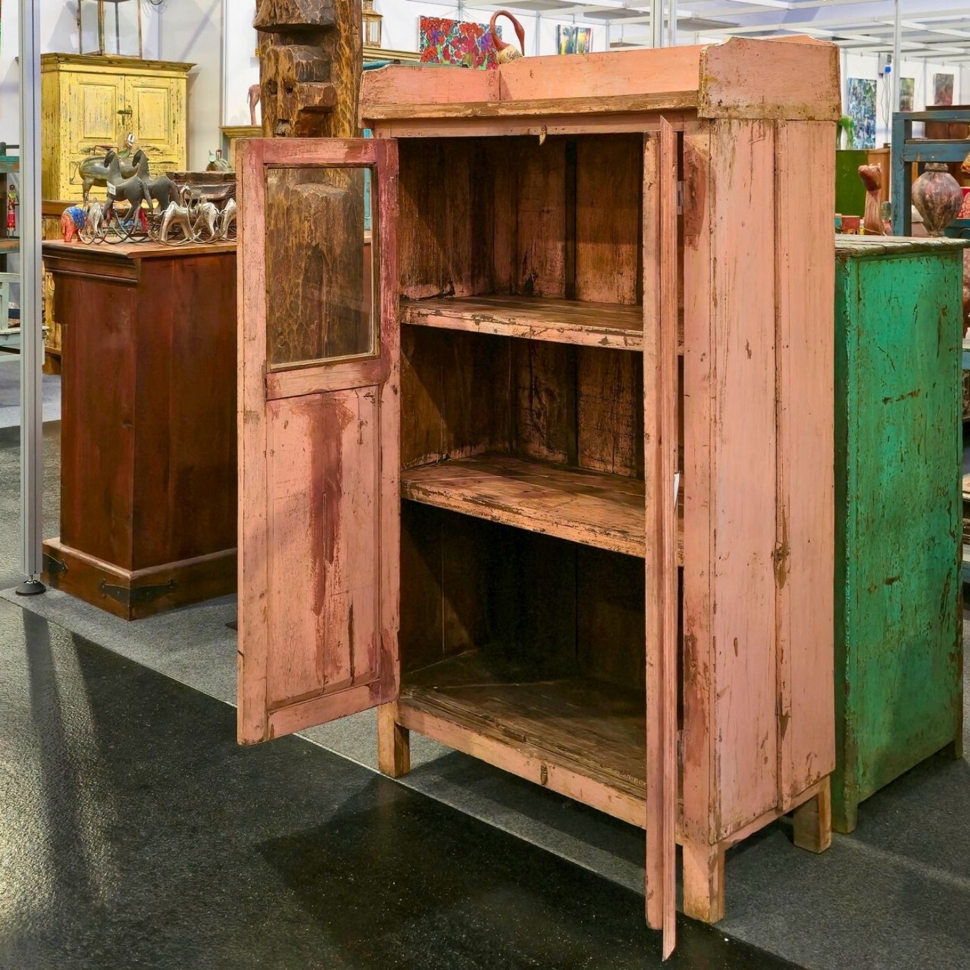 Dieses Vitrinenkästchen aus Holz stammt aus Indien und überzeugt mit seiner charmanten, roséfarbenen Patina und authentischen Gebrauchsspuren. Hinter den zwei verglasten Türen befinden sich zwei Einlegeböden, die Platz für Geschirr, Sammlerstücke oder Dekoration bieten.