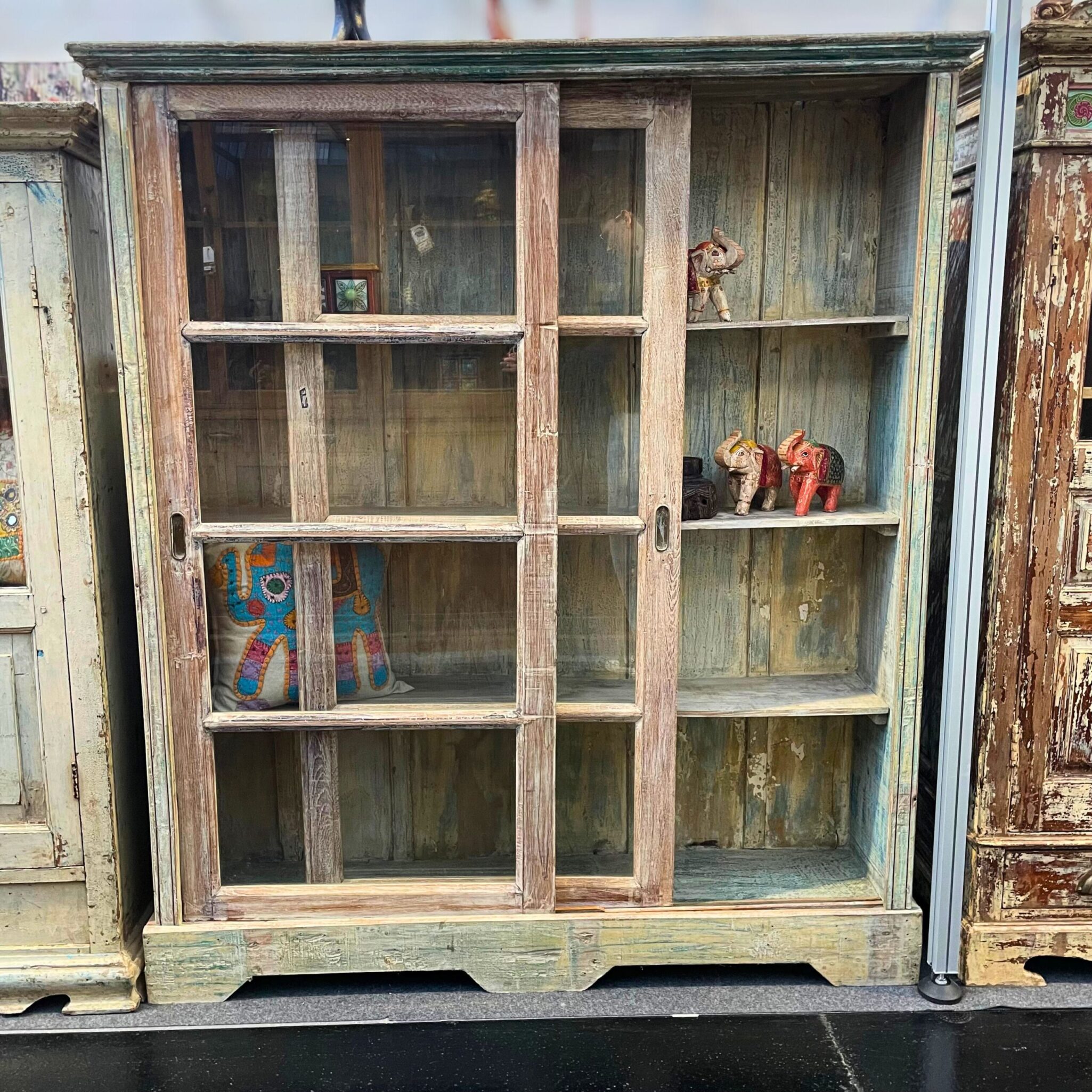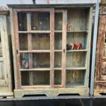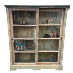 Diese großzügige Vitrine aus Holz verbindet funktionales Design mit authentischem Vintage-Charme.