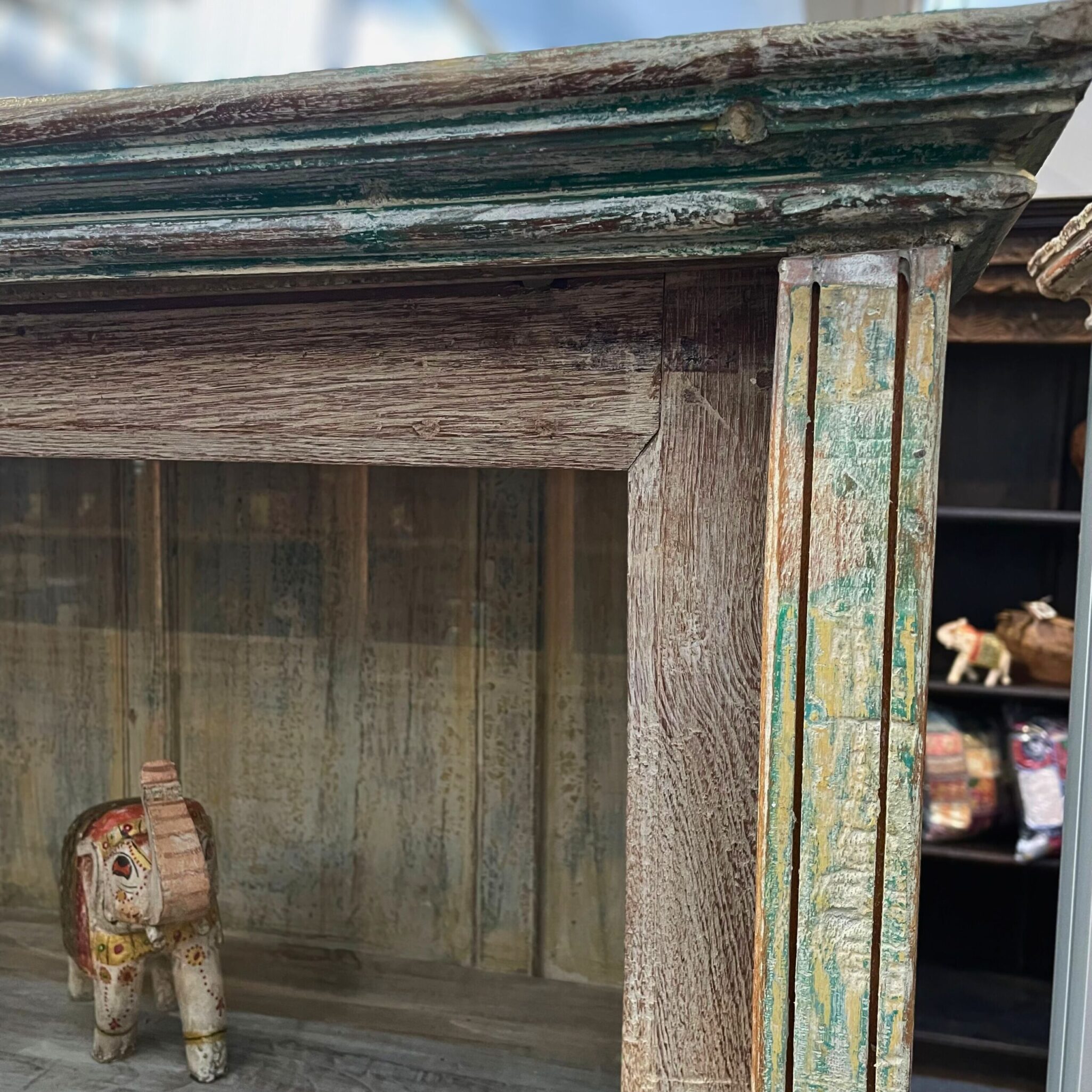 Das naturbelassene Holz mit zarten Farbresten verleiht der Vitrine eine warme, lebendige Ausstrahlung.