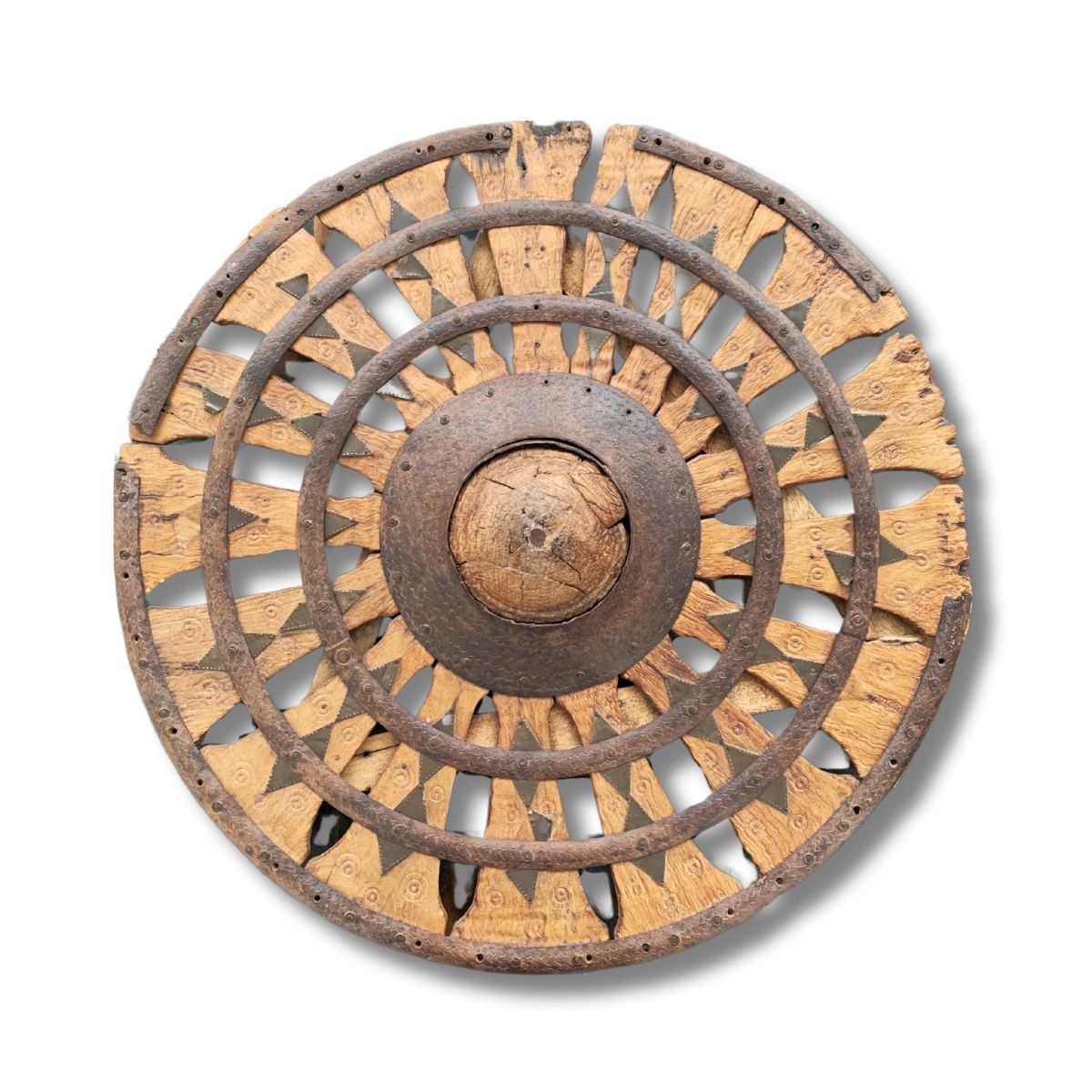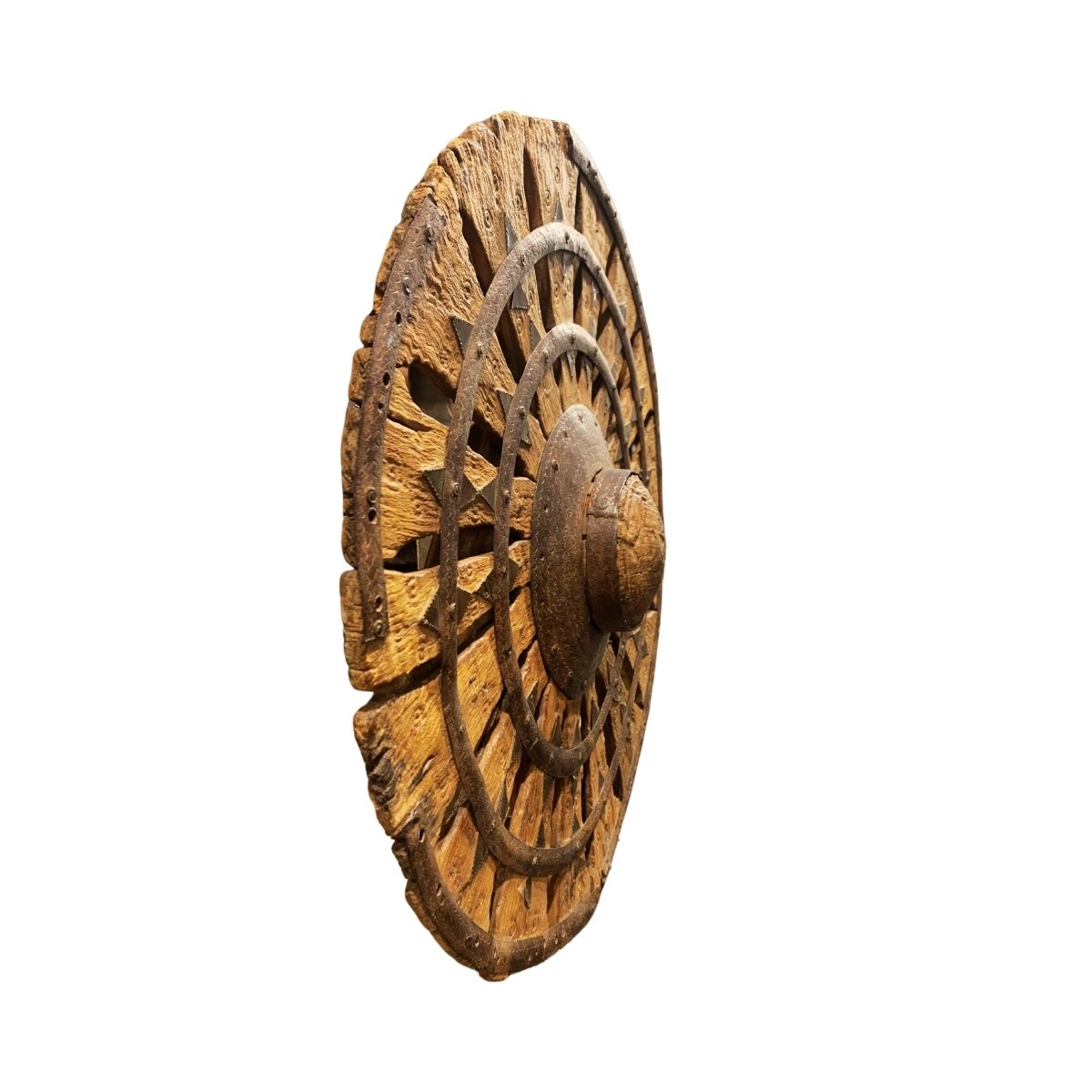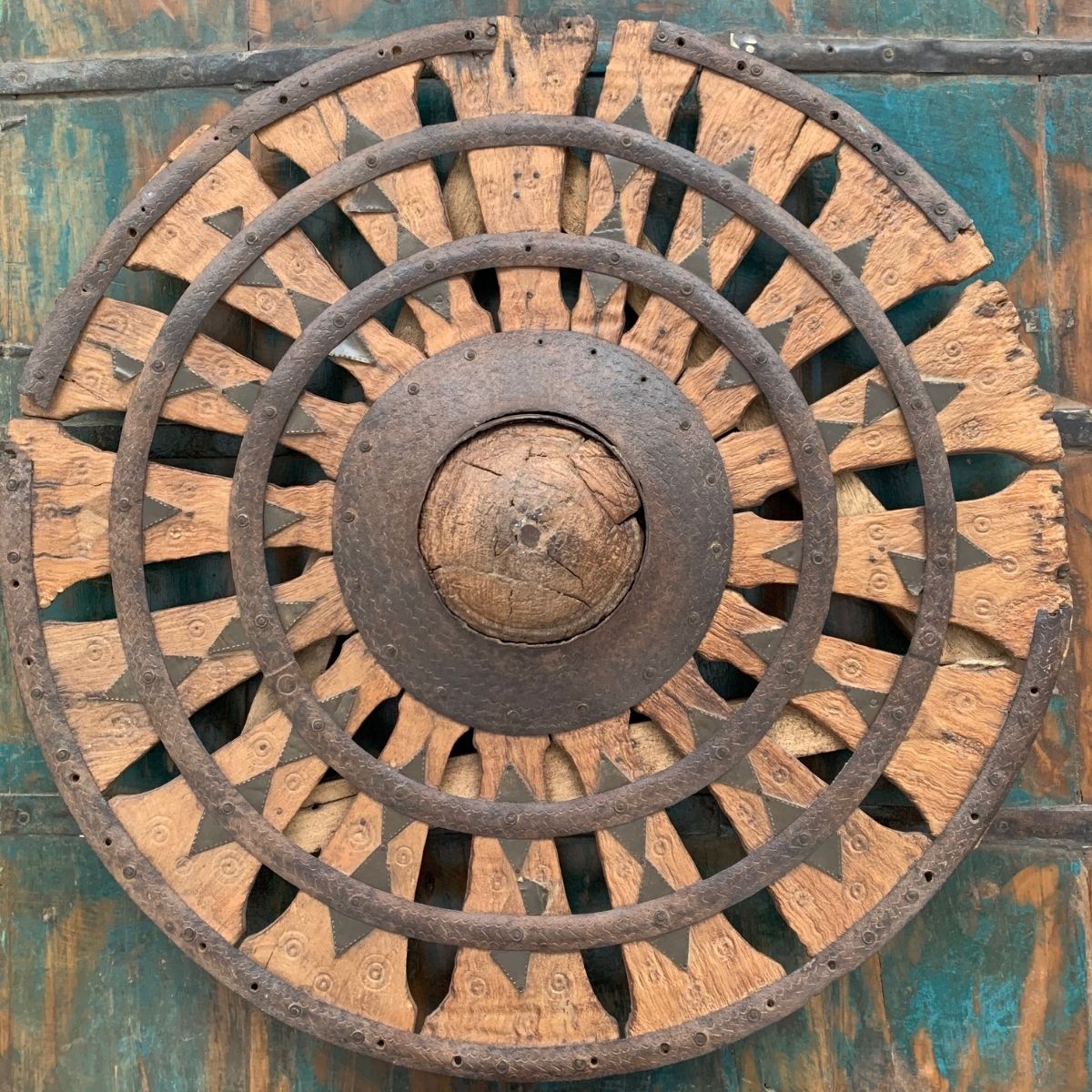 Dieses originale Wagenrad aus Holz und Eisen ist ein handgefertigtes Unikat aus Indien.